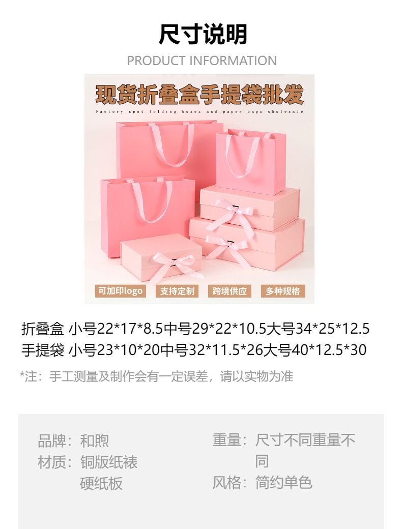 | Especificaciones y modelos | 粉色;小号折叠盒 22*17*8.5cm,粉色;中号折叠盒 29*22*10.5cm,粉色;大号折叠盒 34*25*12.5cm,粉色;小号手提袋 23*10*20cm,粉色;中号手提袋 32*11.5*26cm,粉色;大号手提袋 40*12.5*30cm,粉色;小号礼盒+手提袋,粉色;中号礼盒+手提袋,粉色;大号礼盒+手提袋,黑色;小号折叠盒 22*17*8.5cm,黑色;中号折叠盒 29*22*10.5cm,黑色;大号折叠盒 34*25*12.5cm,黑色;小号手提袋 23*10*20cm,黑色;中号手提袋 32*11.5*26cm,黑色;大号手提袋 40*12.5*30cm,黑色;小号礼盒+手提袋,黑色;中号礼盒+手提袋,黑色;大号礼盒+手提袋,白色;小号折叠盒 22*17*8.5cm,白色;中号折叠盒 29*22*10.5cm,白色;大号折叠盒 34*25*12.5cm,白色;小号手提袋 23*10*20cm,白色;中号手提袋 32*11.5*26cm,白色;大号手提袋 40*12.5*30cm,白色;小号礼盒+手提袋,白色;中号礼盒+手提袋,白色;大号礼盒+手提袋,红色;小号折叠盒 22*17*8.5cm,红色;中号折叠盒 29*22*10.5cm,红色;大号折叠盒 34*25*12.5cm,红色;小号手提袋 23*10*20cm,红色;中号手提袋 32*11.5*26cm,红色;大号手提袋 40*12.5*30cm,红色;小号礼盒+手提袋,红色;中号礼盒+手提袋,红色;大号礼盒+手提袋,米白色;小号折叠盒 22*17*8.5cm,米白色;中号折叠盒 29*22*10.5cm,米白色;大号折叠盒 34*25*12.5cm,米白色;小号手提袋 23*10*20cm,米白色;中号手提袋 32*11.5*26cm,米白色;大号手提袋 40*12.5*30cm,米白色;小号礼盒+手提袋,米白色;中号礼盒+手提袋,米白色;大号礼盒+手提袋,绿色;小号折叠盒 22*17*8.5cm,绿色;中号折叠盒 29*22*10.5cm,绿色;大号折叠盒 34*25*12.5cm,绿色;小号手提袋 23*10*20cm,绿色;中号手提袋 32*11.5*26cm,绿色;大号手提袋 40*12.5*30cm,绿色;小号礼盒+手提袋,绿色;中号礼盒+手提袋,绿色;大号礼盒+手提袋,玫瑰金;小号折叠盒 22*17*8.5cm,玫瑰金;中号折叠盒 29*22*10.5cm,玫瑰金;大号折叠盒 34*25*12.5cm,玫瑰金;小号手提袋 23*10*20cm,玫瑰金;中号手提袋 32*11.5*26cm,玫瑰金;大号手提袋 40*12.5*30cm,玫瑰金;小号礼盒+手提袋,玫瑰金;中号礼盒+手提袋,玫瑰金;大号礼盒+手提袋,蓝色;小号折叠盒 22*17*8.5cm,蓝色;中号折叠盒 29*22*10.5cm,蓝色;大号折叠盒 34*25*12.5cm,浅蓝色;小号折叠盒 22*17*8.5cm,浅蓝色;中号折叠盒 29*22*10.5cm,浅蓝色;大号折叠盒 34*25*12.5cm |
