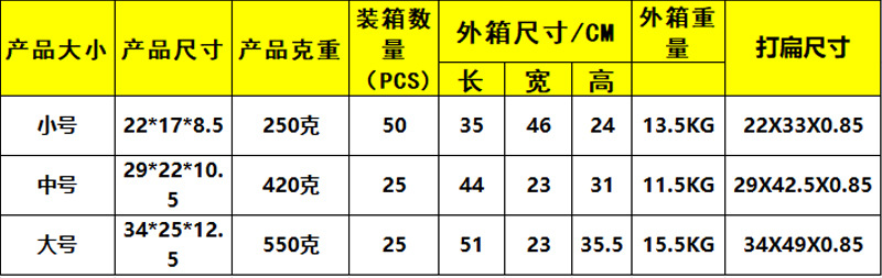 | Especificaciones | Grande 34 * 25 * 12,5 cm, pequeño 22 * 17 * 8,5 cm, medio 29 * 22 * 10,5 cm |