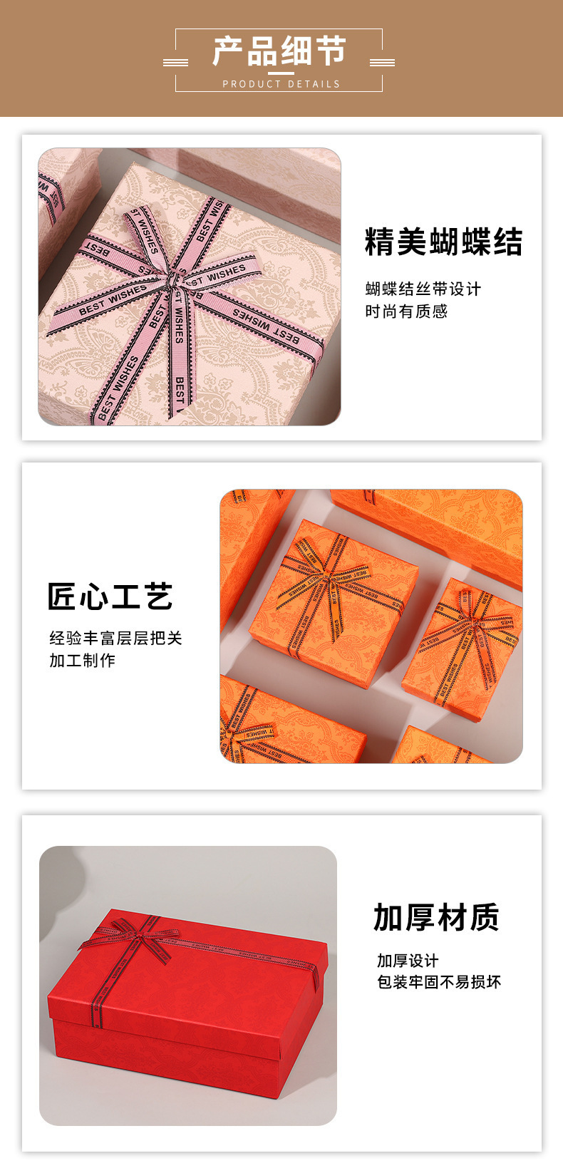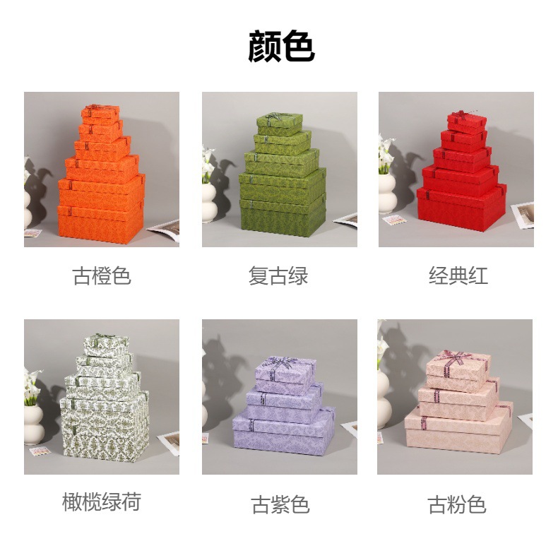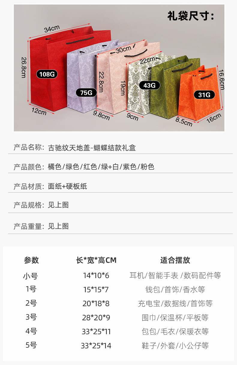 | Especificaciones y modelos | 古橙色;1号礼盒:15*15*7,古橙色;2号礼盒:20*18*8,古橙色;3号礼盒:28*20*9,古橙色;4号礼盒:33*25*11,古橙色;5号礼盒:33*25*14,古橙色;1号袋子17*16*8.5,古橙色;2号袋子22*19*9,古橙色;3号袋子30*23*10,古橙色;4号袋子34*27*15,古橙色;5号袋子34*27*15,复古绿;1号礼盒:15*15*7,复古绿;2号礼盒:20*18*8,复古绿;3号礼盒:28*20*9,复古绿;4号礼盒:33*25*11,复古绿;5号礼盒:33*25*14,复古绿;1号袋子17*16*8.5,复古绿;2号袋子22*19*9,复古绿;3号袋子30*23*10,复古绿;4号袋子34*27*15,复古绿;5号袋子34*27*15,经典红;1号礼盒:15*15*7,经典红;2号礼盒:20*18*8,经典红;3号礼盒:28*20*9,经典红;4号礼盒:33*25*11,经典红;5号礼盒:33*25*14,经典红;1号袋子17*16*8.5,经典红;2号袋子22*19*9,经典红;3号袋子30*23*10,经典红;4号袋子34*27*15,经典红;5号袋子34*27*15,橄榄绿;1号礼盒:15*15*7,橄榄绿;2号礼盒:20*18*8,橄榄绿;3号礼盒:28*20*9,橄榄绿;4号礼盒:33*25*11,橄榄绿;5号礼盒:33*25*14,橄榄绿;1号袋子17*16*8.5,橄榄绿;2号袋子22*19*9,橄榄绿;3号袋子30*23*10,橄榄绿;4号袋子34*27*15,橄榄绿;5号袋子34*27*15,古紫色;1号礼盒:15*15*7,古紫色;2号礼盒:20*18*8,古紫色;3号礼盒:28*20*9,古紫色;1号袋子17*16*8.5,古紫色;2号袋子22*19*9,古紫色;3号袋子30*23*10,古粉色;1号礼盒:15*15*7,古粉色;2号礼盒:20*18*8,古粉色;3号礼盒:28*20*9,古粉色;1号袋子17*16*8.5,古粉色;2号袋子22*19*9,古粉色;3号袋子30*23*10 |