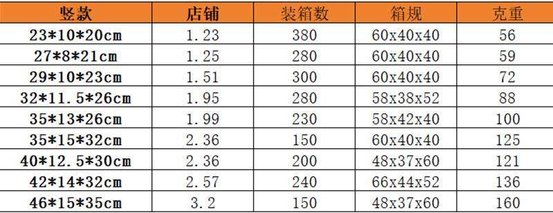 | Especificaciones | 23*10*20cm,35*13*26cm,29*10*23cm,42*14*32cm,46*15*35cm,27*8*21cm,35*15*32cm,40*12.5*30cm,32*11.5*26cm |