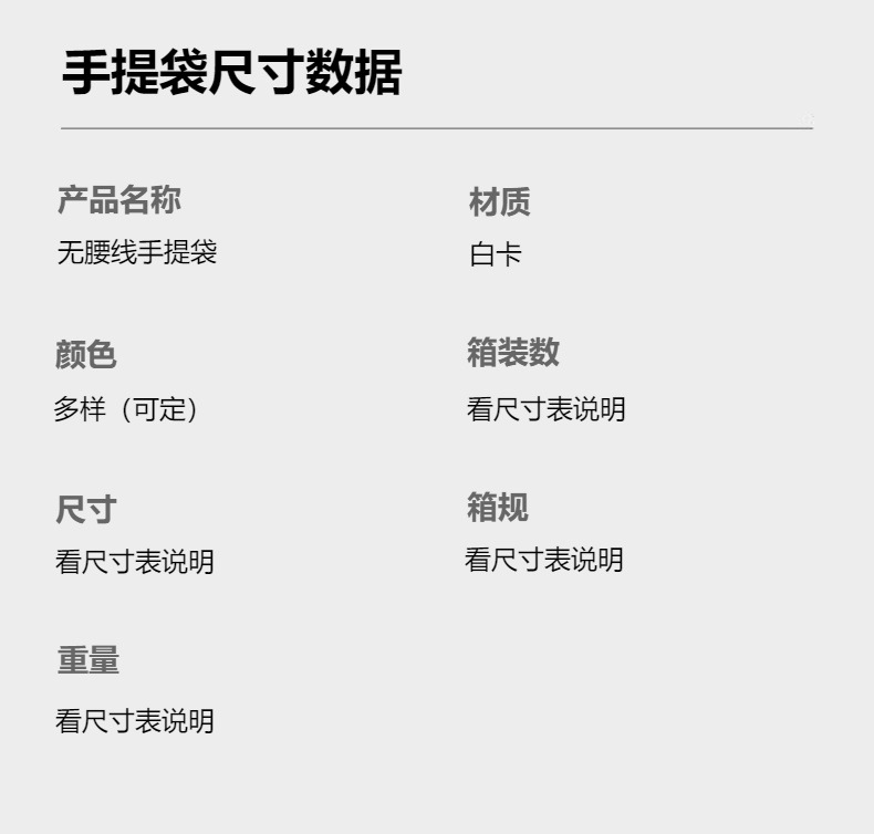 | Especificaciones y modelos | 粉色手提袋;23*10*20cm,粉色手提袋;27*8*21cm,粉色手提袋;29*10*23cm,粉色手提袋;32*11.5*26cm,粉色手提袋;35*13*26cm,粉色手提袋;35*15*32cm,粉色手提袋;40*12.5*30cm,粉色手提袋;42*14*32cm,粉色手提袋;46*15*35cm,黑色手提袋;23*10*20cm,黑色手提袋;27*8*21cm,黑色手提袋;29*10*23cm,黑色手提袋;32*11.5*26cm,黑色手提袋;35*13*26cm,黑色手提袋;35*15*32cm,黑色手提袋;40*12.5*30cm,黑色手提袋;42*14*32cm,黑色手提袋;46*15*35cm,白色手提袋;23*10*20cm,白色手提袋;27*8*21cm,白色手提袋;29*10*23cm,白色手提袋;32*11.5*26cm,白色手提袋;35*13*26cm,白色手提袋;35*15*32cm,白色手提袋;40*12.5*30cm,白色手提袋;42*14*32cm,白色手提袋;46*15*35cm,红色手提袋;23*10*20cm,红色手提袋;27*8*21cm,红色手提袋;29*10*23cm,红色手提袋;32*11.5*26cm,红色手提袋;35*13*26cm,红色手提袋;35*15*32cm,红色手提袋;40*12.5*30cm,红色手提袋;42*14*32cm,红色手提袋;46*15*35cm,米白色手提袋;23*10*20cm,米白色手提袋;27*8*21cm,米白色手提袋;29*10*23cm,米白色手提袋;32*11.5*26cm,米白色手提袋;35*13*26cm,米白色手提袋;35*15*32cm,米白色手提袋;40*12.5*30cm,米白色手提袋;42*14*32cm,米白色手提袋;46*15*35cm,绿色手提袋;23*10*20cm,绿色手提袋;27*8*21cm,绿色手提袋;29*10*23cm,绿色手提袋;32*11.5*26cm,绿色手提袋;35*13*26cm,绿色手提袋;35*15*32cm,绿色手提袋;40*12.5*30cm,绿色手提袋;42*14*32cm,绿色手提袋;46*15*35cm,玫瑰金手提袋;23*10*20cm,玫瑰金手提袋;27*8*21cm,玫瑰金手提袋;29*10*23cm,玫瑰金手提袋;32*11.5*26cm,玫瑰金手提袋;35*13*26cm,玫瑰金手提袋;35*15*32cm,玫瑰金手提袋;40*12.5*30cm,玫瑰金手提袋;42*14*32cm,玫瑰金手提袋;46*15*35cm,灰色手提袋;23*10*20cm,灰色手提袋;27*8*21cm,灰色手提袋;29*10*23cm,灰色手提袋;32*11.5*26cm,灰色手提袋;35*13*26cm,灰色手提袋;35*15*32cm,灰色手提袋;40*12.5*30cm,灰色手提袋;42*14*32cm,灰色手提袋;46*15*35cm,橙色手提袋;23*10*20cm,橙色手提袋;27*8*21cm,橙色手提袋;29*10*23cm,橙色手提袋;32*11.5*26cm,橙色手提袋;35*13*26cm,橙色手提袋;35*15*32cm,橙色手提袋;40*12.5*30cm,橙色手提袋;42*14*32cm,橙色手提袋;46*15*35cm |