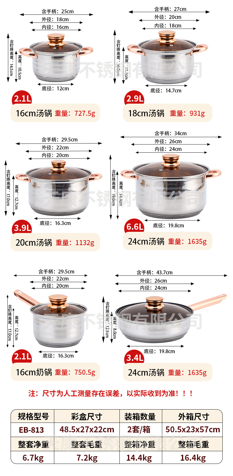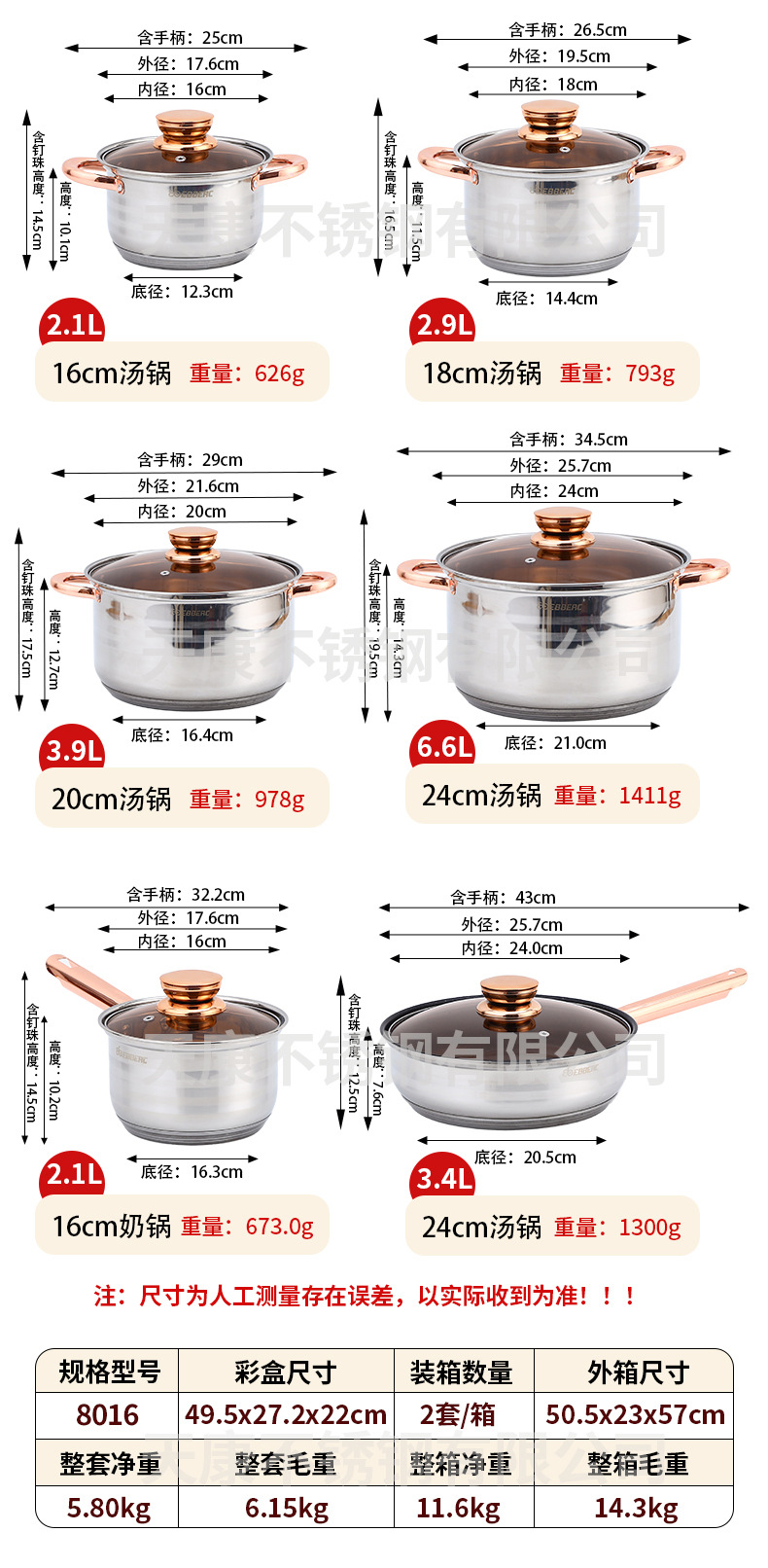| Configuración del conjunto | 16 Mango único cm 16 Mango doble cm 18 Mango doble cm 20 Mango doble cm 24 Mango doble cm 24 sartén cm |