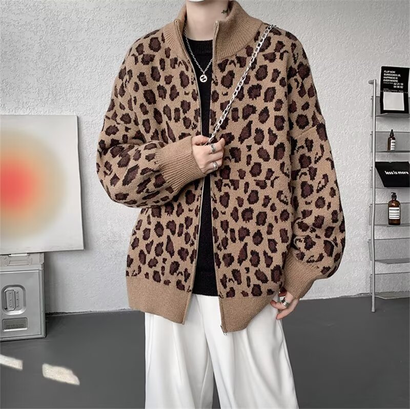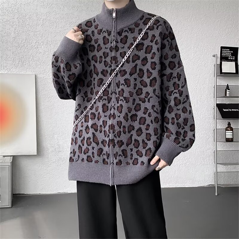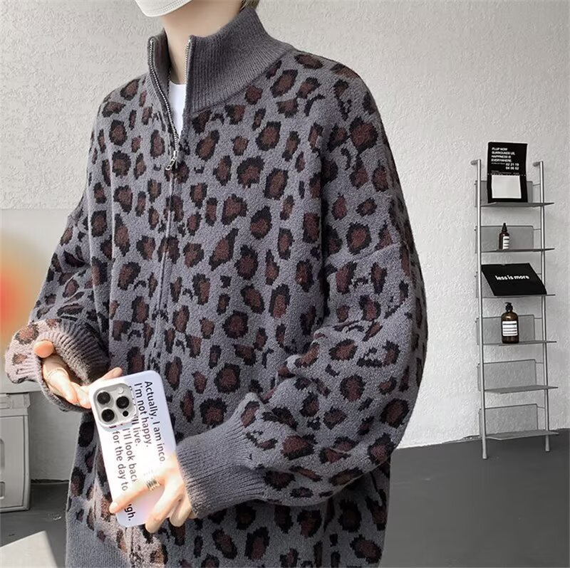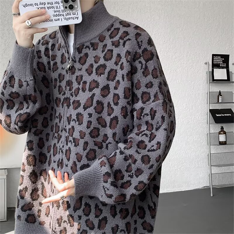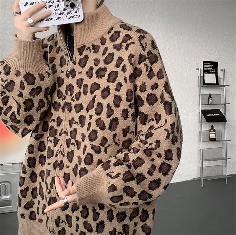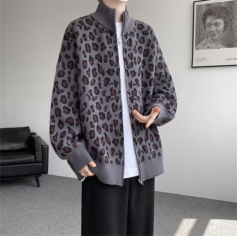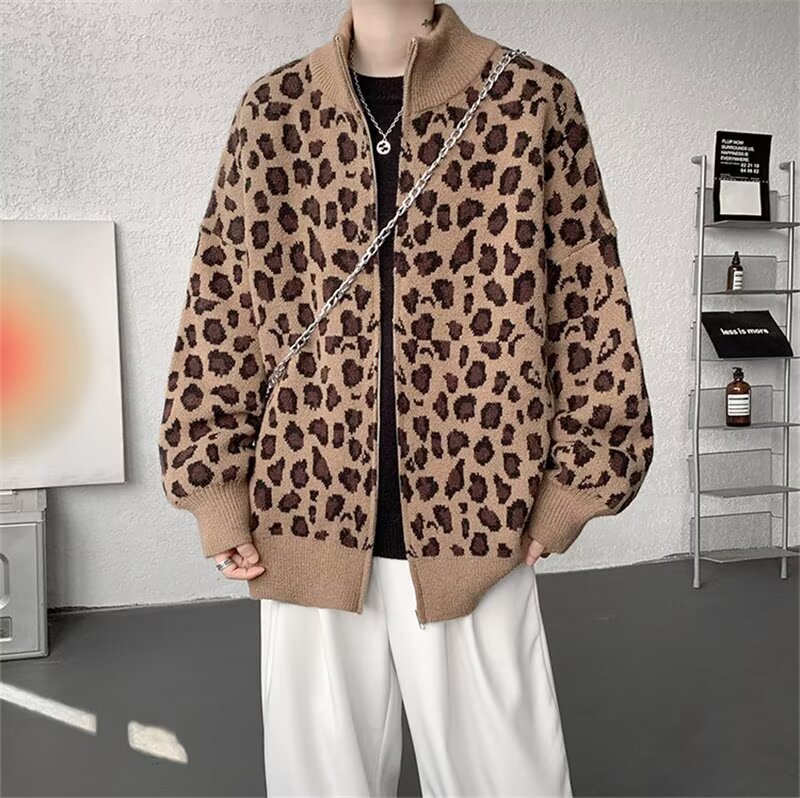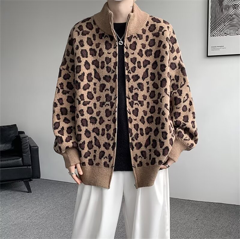 Explosiones transfronterizas de tamaño europeo de tamaño grande leopardo cardigán chaqueta jersey jersey hombre alto otoño invierno fábrica de suéter al por mayor