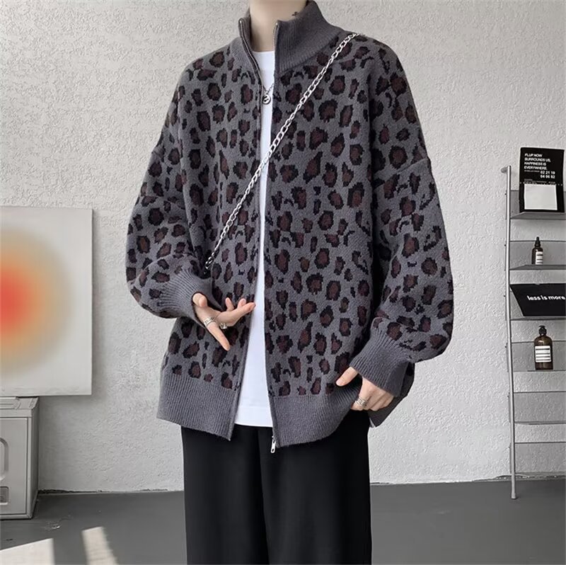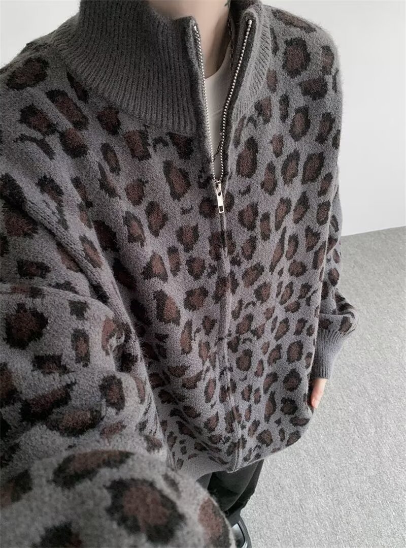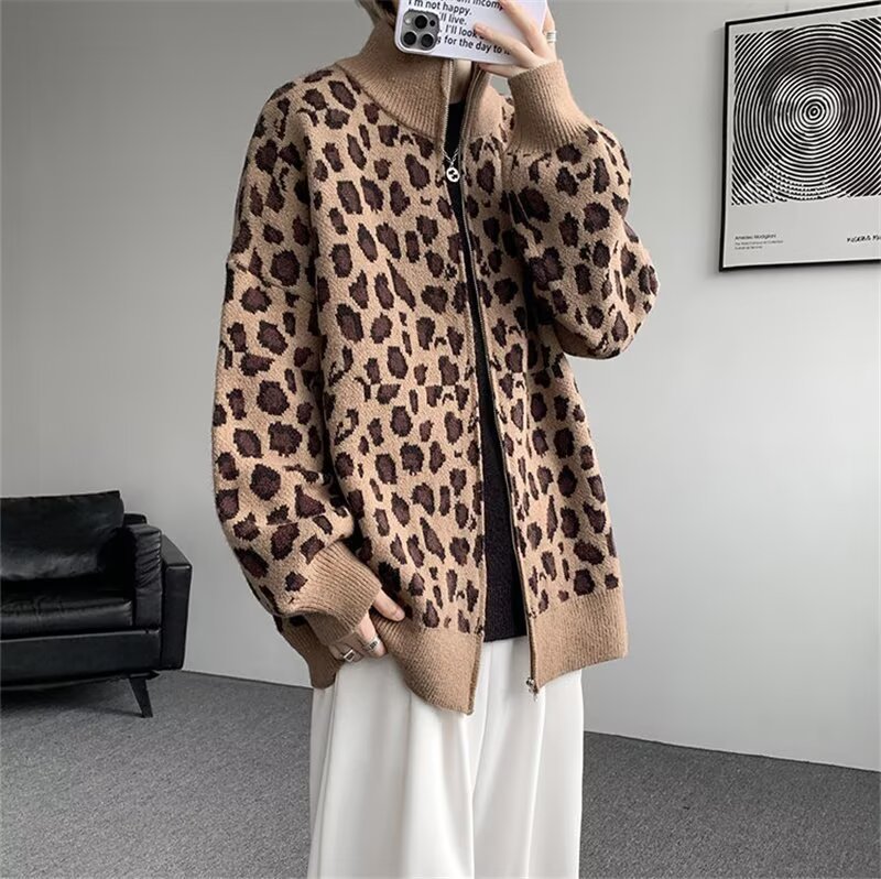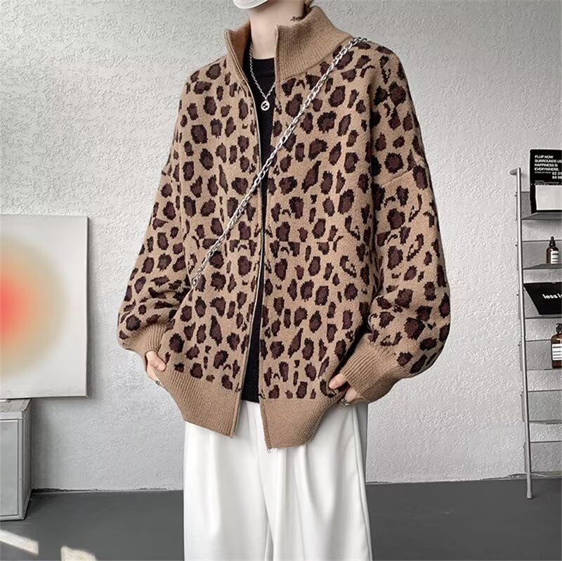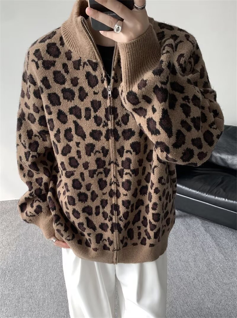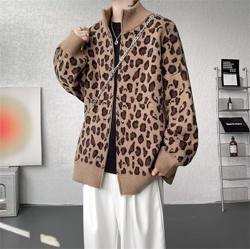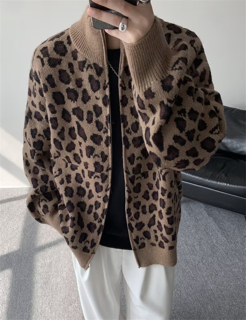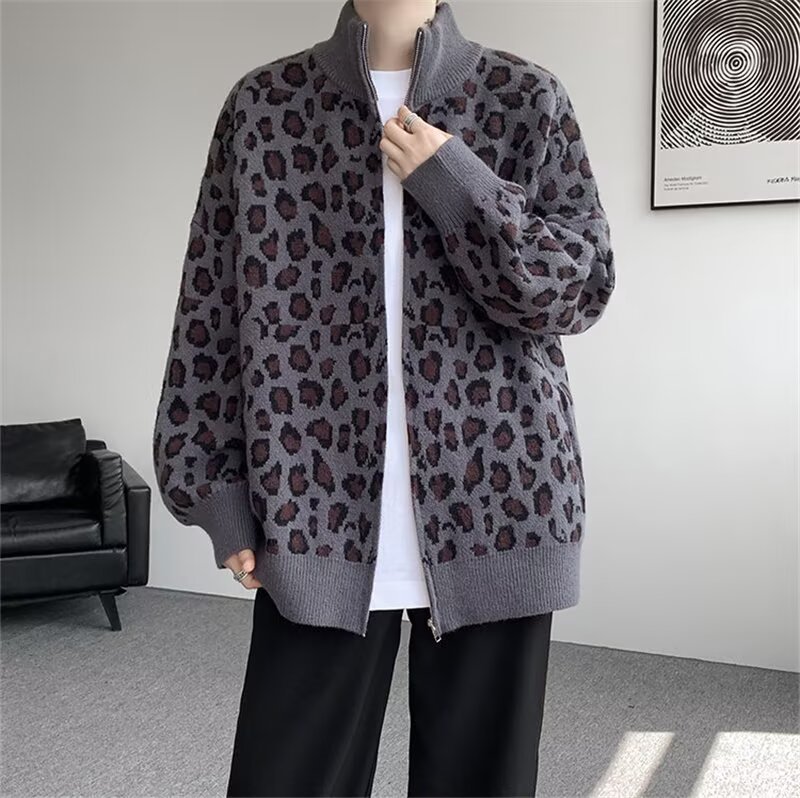 Explosiones transfronterizas de tamaño europeo de tamaño grande leopardo cardigán chaqueta jersey jersey hombre alto otoño invierno fábrica de suéter al por mayor