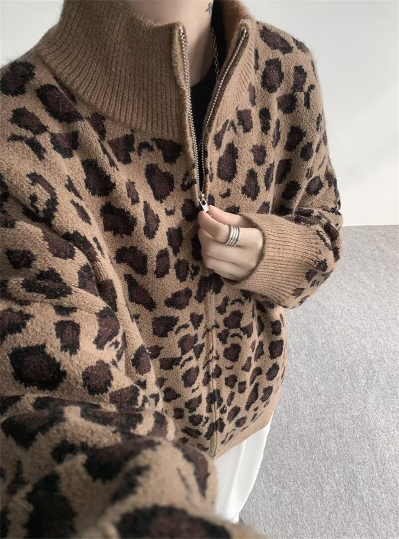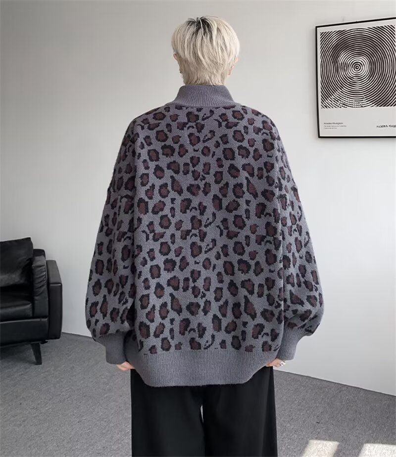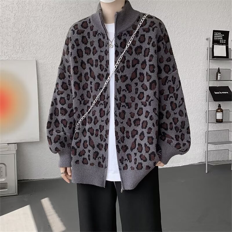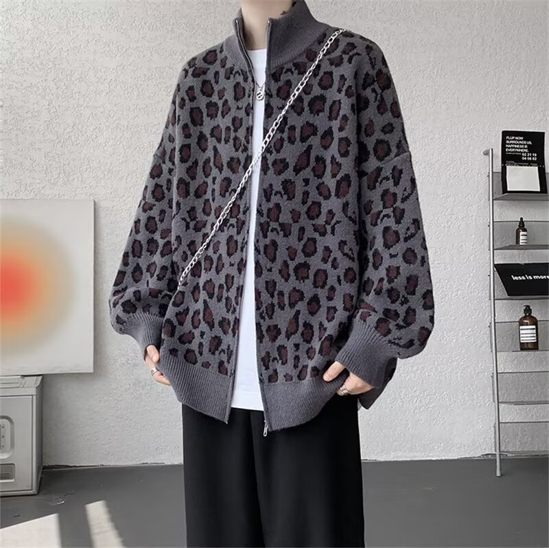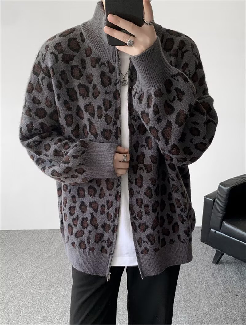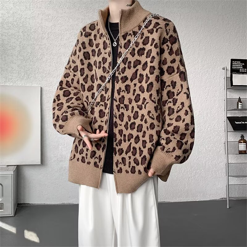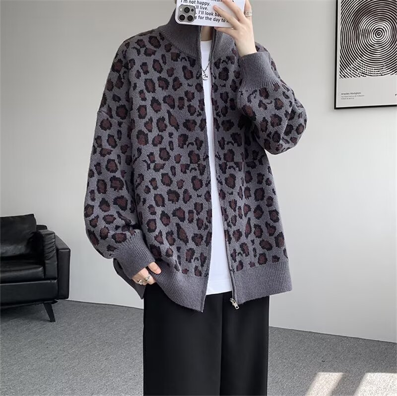 Explosiones transfronterizas de tamaño europeo de tamaño grande leopardo cardigán chaqueta jersey jersey hombre alto otoño invierno fábrica de suéter al por mayor