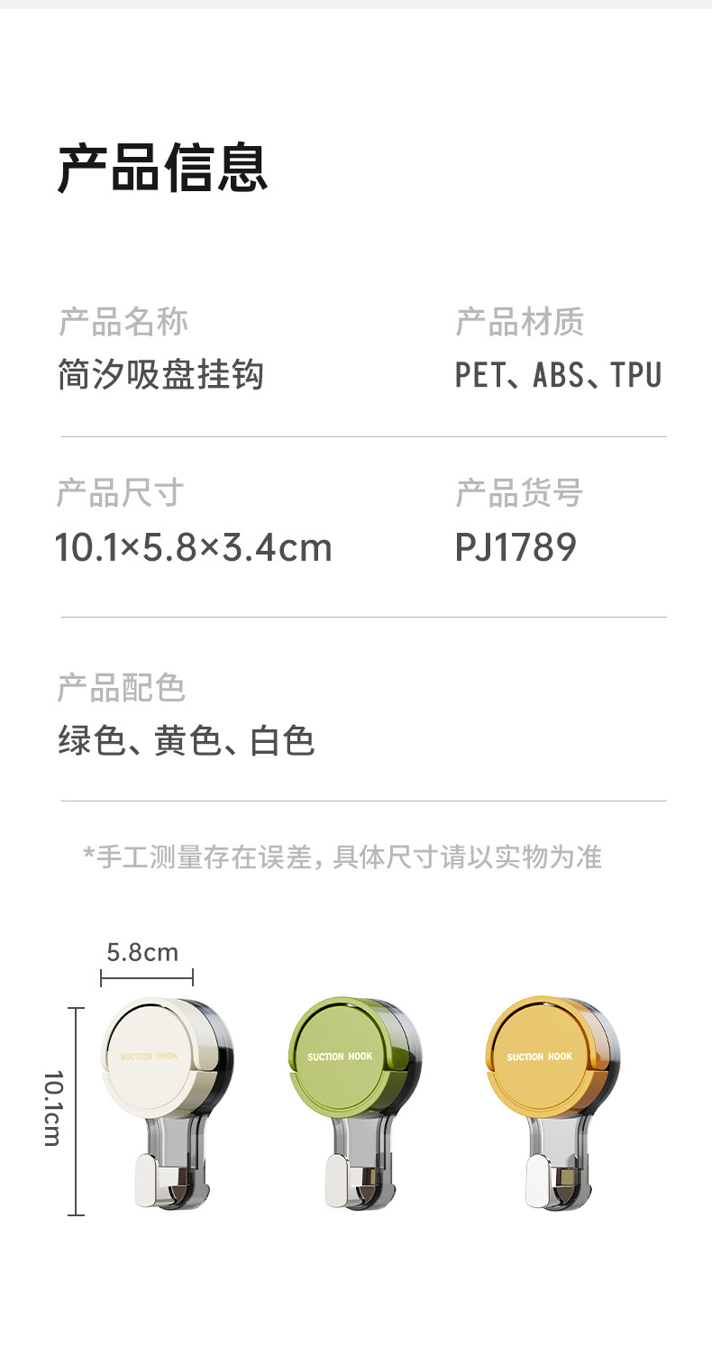 | Color | Blanco (gancho de cabeza única), verde (gancho de cabeza única), amarillo (gancho de cabeza única), blanco (gancho de cabeza doble) puede colgar toallas de lavado facial, verde (gancho de cabeza doble) puede colgar toallas de lavado facial, amarillo (gancho de cabeza doble) puede colgar toallas de lavado facial |