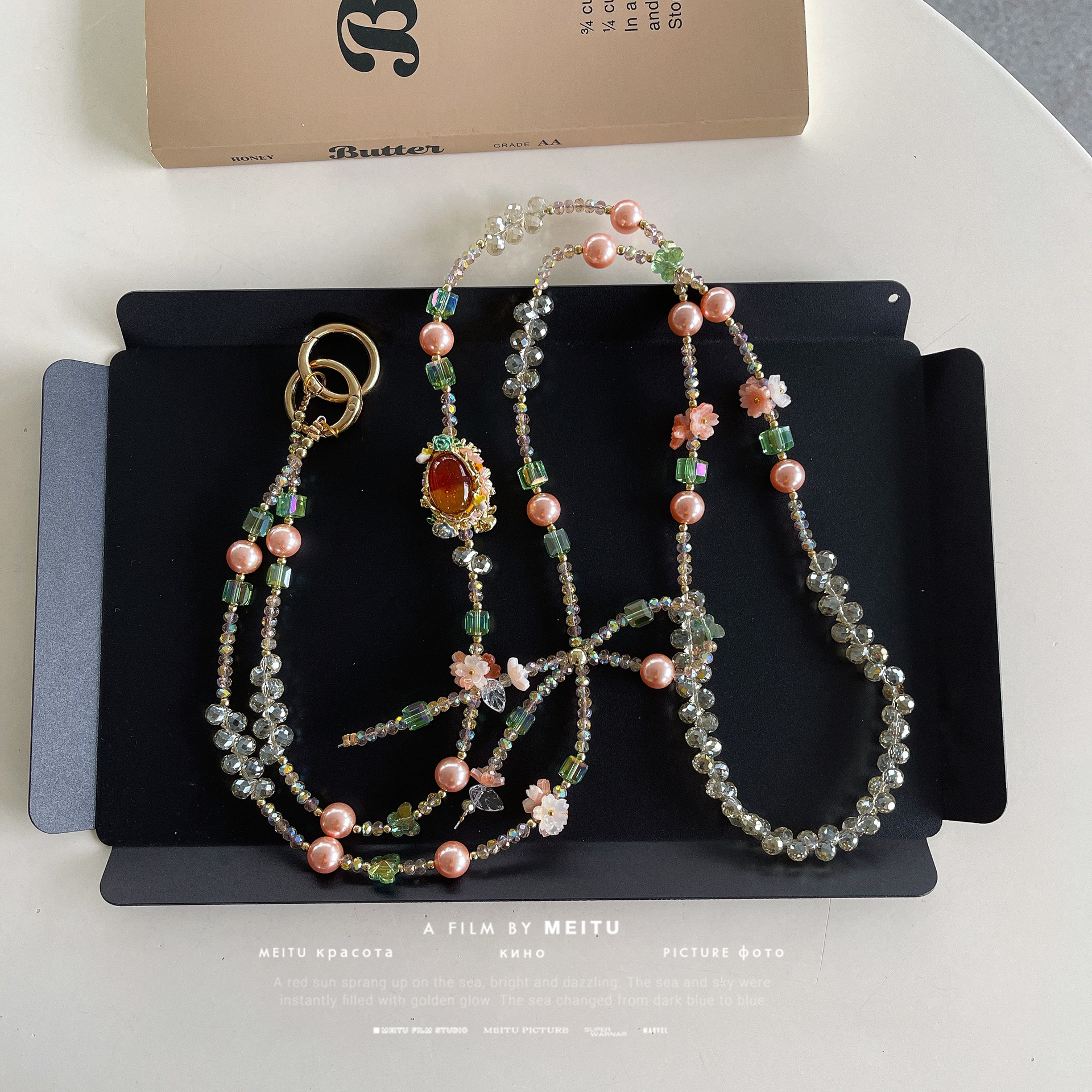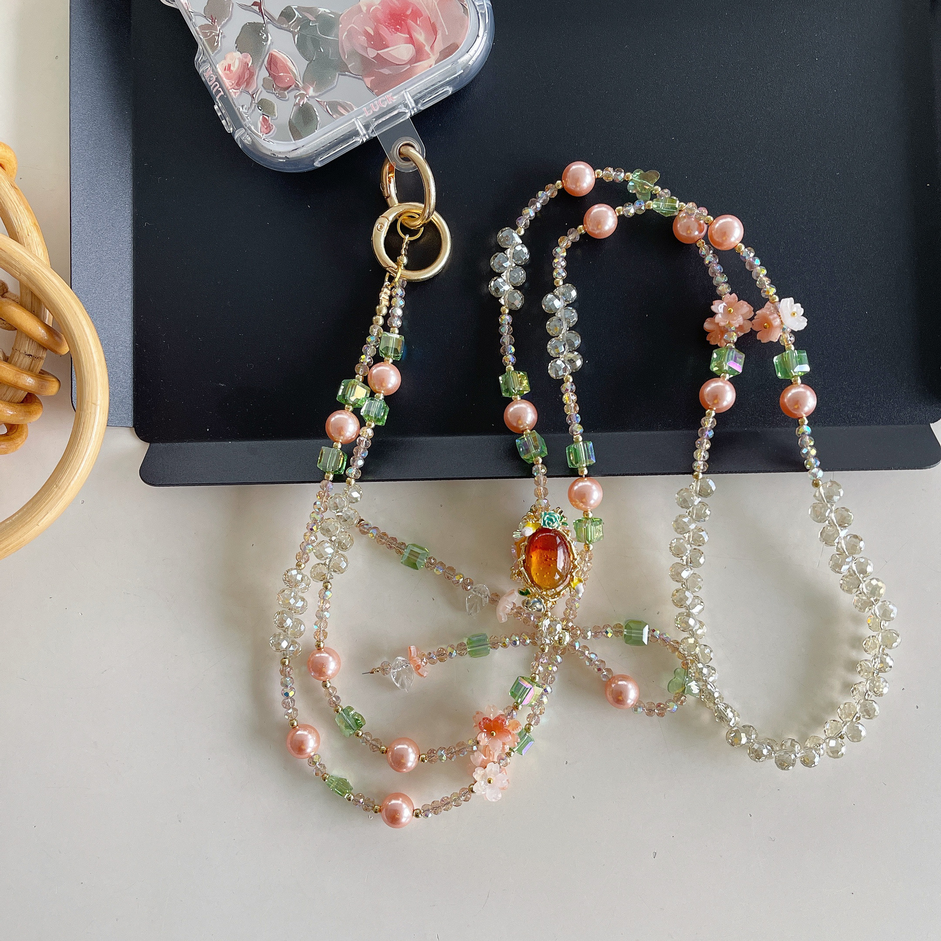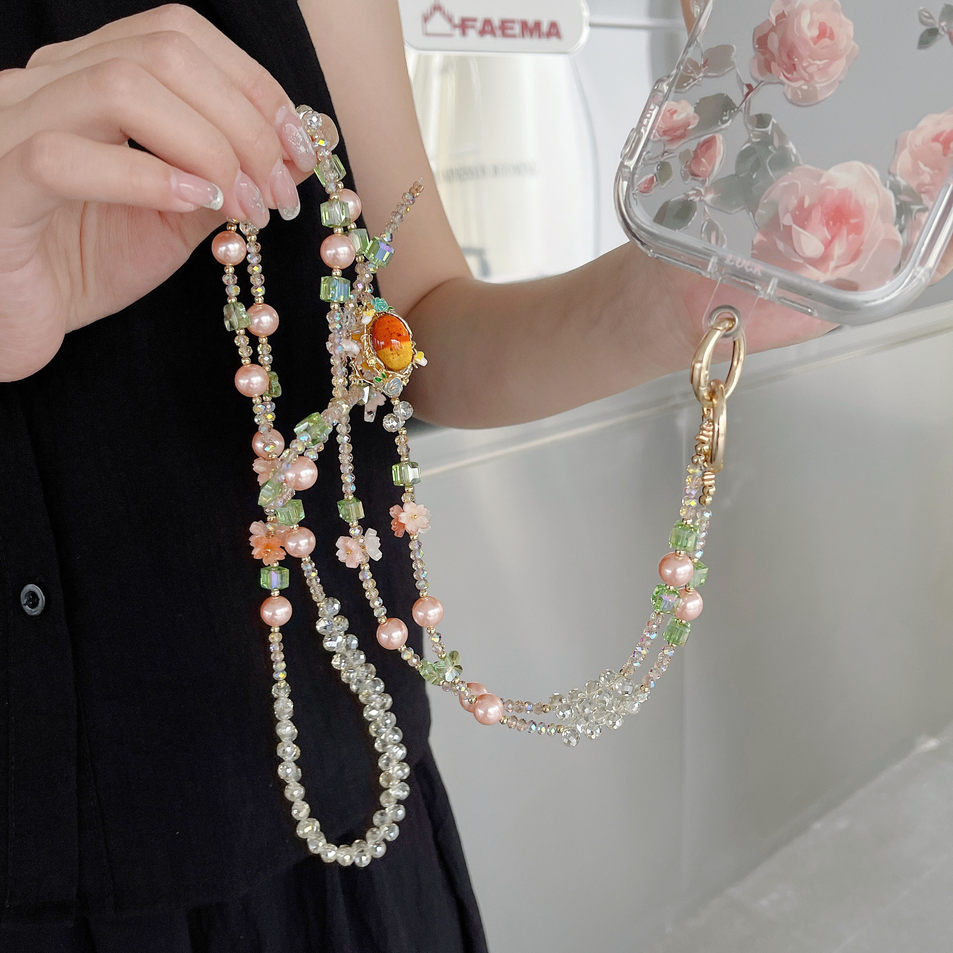 Cadena de teléfono móvil de alta gama hecha a mano boutique, cadena larga de cristal de lago femenino, cordón de teléfono móvil de moda, colgante de mensajero largo
