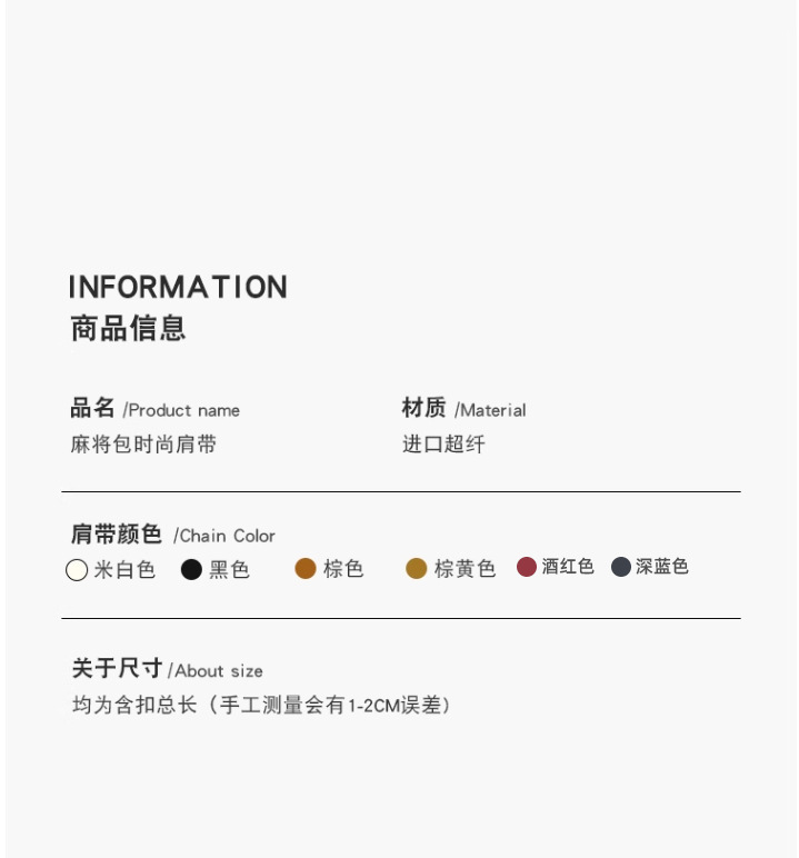| Colores | Colores de accesorios de hardware reemplazables [comuníquese con el servicio al cliente],[Blanco glaciar] 1.2cm de ancho ajustable 90 · 120cm,[Blanco beige] 1.2cm de ancho ajustable 90 · 120cm,[Azul oscuro] 1.2cm de ancho ajustable 90 · 120cm,[Marrón] 1.2cm de ancho ajustable 90 · 120cm,[Marrón amarillo] 1.2cm de ancho ajustable 90 · 120cm,[Caqui] 1.2cm de ancho ajustable 90 · 120cm,[Rojo vino] 1.2cm de ancho ajustable 90 · 120cm,[Taro púrpura] 1.2cm de ancho ajustable 100 · 120cm,[Rosa claro] 1.2cm de ancho ajustable 100 · 120cm,[Hebilla plateada marrón oscuro] 1,2 cm de ancho, ajustable 90·120 cm,[Rojo grande] 1.2cm de ancho ajustable 100 · 120cm,[Hebilla dorada marrón oscuro] 1,2 cm de ancho, ajustable 90·120 cm,[Blanco glaciar] 1,5 cm de ancho ajustable 90 · 120cm,[Blanco beige] 1,5 cm de ancho ajustable 90 · 120cm,[Azul oscuro] 1,5 cm de ancho ajustable 90 · 120cm,[Color café oscuro] 1,5 cm de ancho, ajustable 90·120 cm,[Marrón] 1,5 cm de ancho ajustable 90 · 120cm,[Marrón amarillo] 1,5 cm de ancho ajustable 90 · 120cm,[Rojo vino] 1.5cm de ancho ajustable 90 · 120cm,[Taro púrpura] 1.5cm de ancho ajustable 100 · 120cm,[Rosa claro] 1,5 cm de ancho ajustable 100 · 120cm,[Rojo grande] 1.5cm de ancho ajustable 100 · 120cm,[Negro] 1.2cm de ancho ajustable 90 · 120cm,[Negro] 1,5 cm de ancho ajustable 90 · 120cm,[Caqui] 1,5 cm de ancho ajustable 90 · 120cm,Blanco glaciar 65cm,Blanco 65cm,Azul de tela fragante 65cm,Negro 65cm,Marrón 65cm,Rojo grande 65cm |