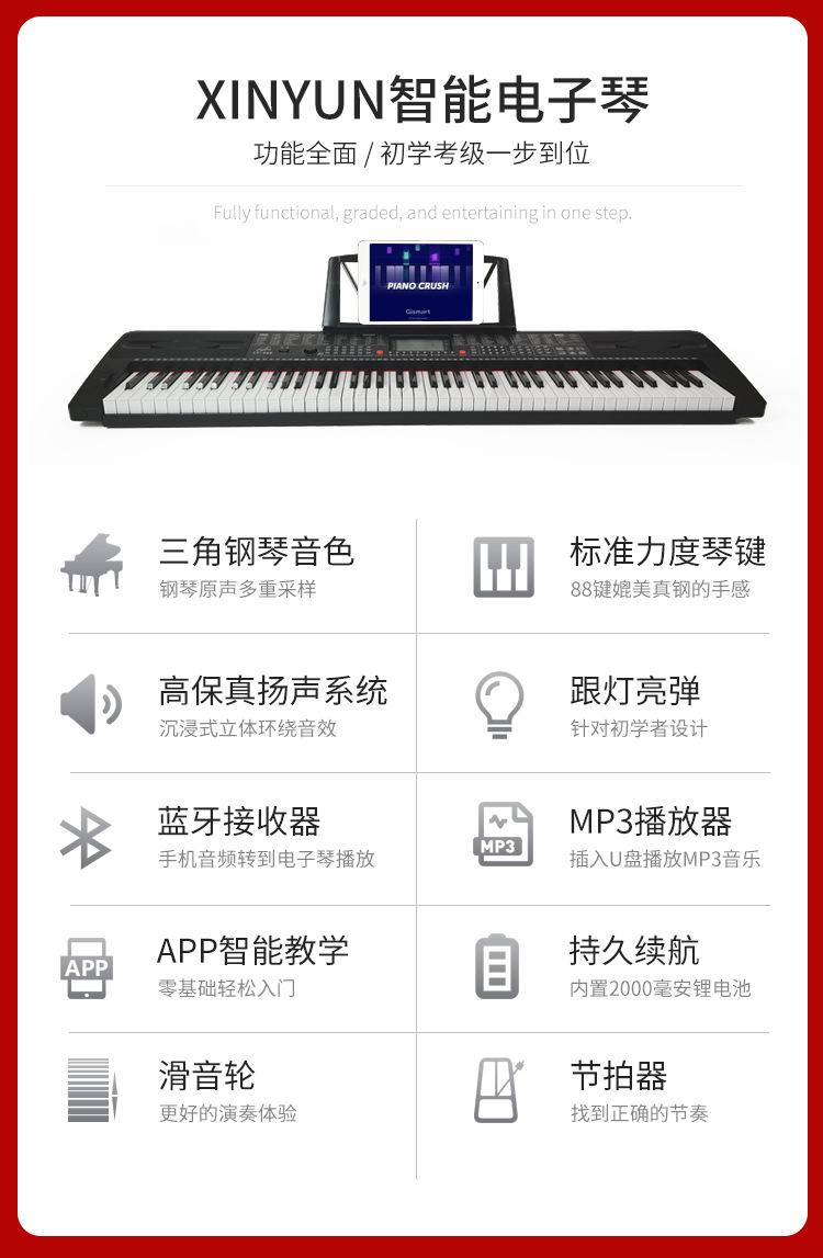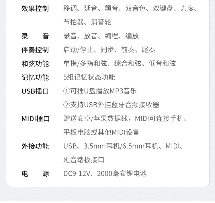 ● 前奏/尾奏、节拍器、双键盘、双音色、滑音轮