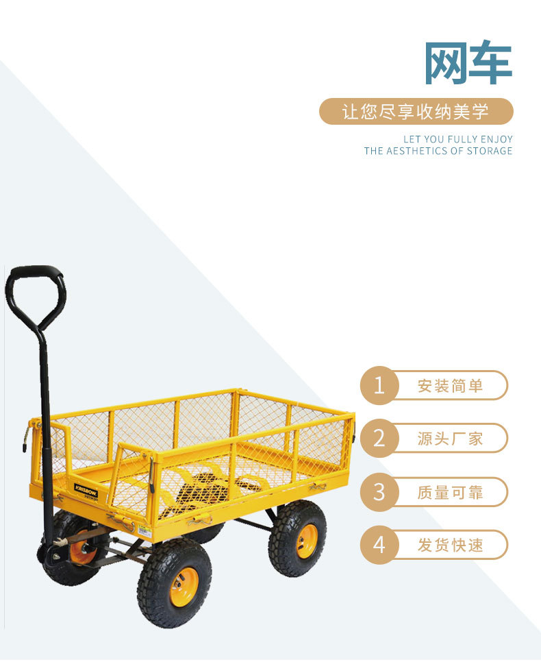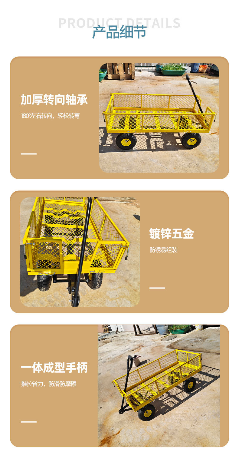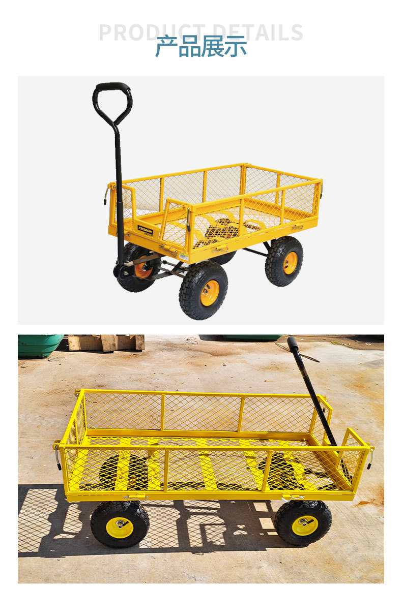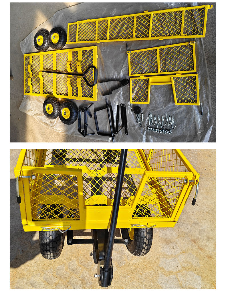 Carro de jardín de cuatro ruedas práctico de acero desmontable lateral para remolque al aire libre para herramientas de jardín pesadas