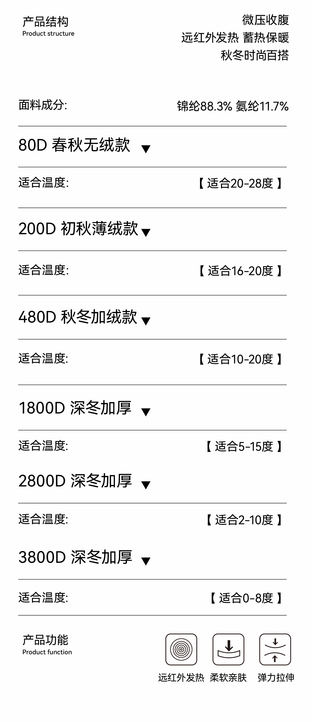 | Talla | 80D delgado sin terciopelo - [adecuado para 20 - 28 °C]; 200D de espesor medio sin terciopelo - [adecuado para 16 - 20 °C]; 480D grueso sin terciopelo - [adecuado para 10 - 20 °C]; 1800D con terciopelo [adecuado para 5 - 15 °C]; 2800D con terciopelo [adecuado para 2 - 10 °C]; 3800D con terciopelo - [adecuado para 0 - 8 °C] |