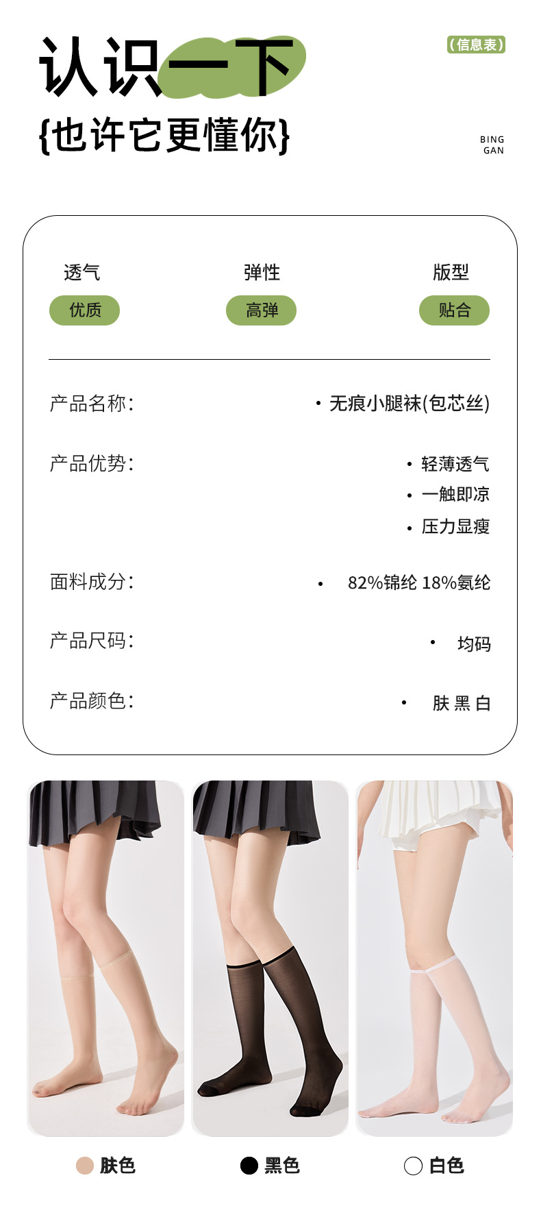 | Color | Calcetines de pantorrilla negros, calcetines de pantorrilla de color de piel, calcetines de rodilla blancas, calcetines de rodilla negros, calcetines de rodilla de color de piel |