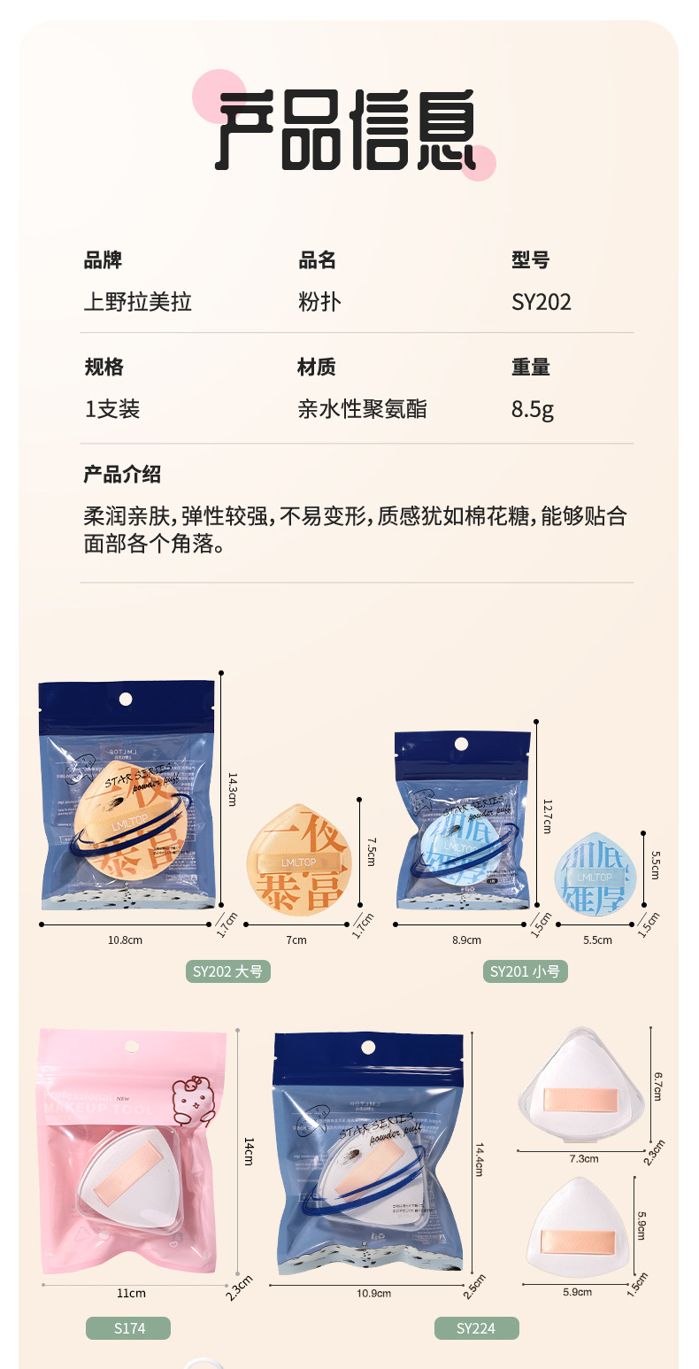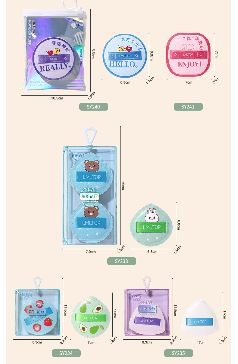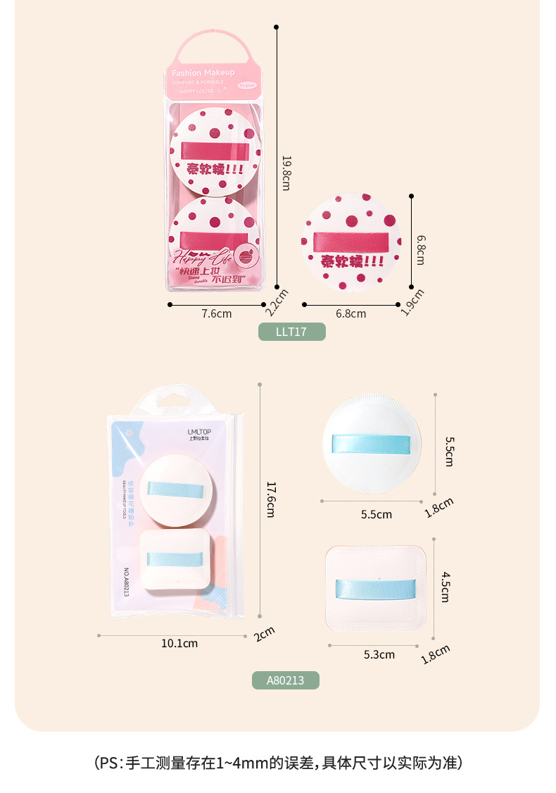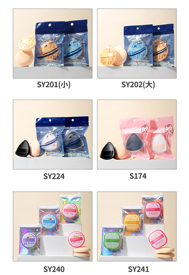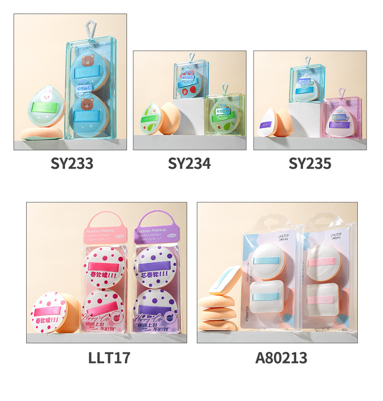 | Especificaciones | SY212 impreso polvo soplo dos paquete (material de Rubycell),SY221 tablero de ajedrez rejilla powder puff dos Pack (con caja de almacenamiento) |