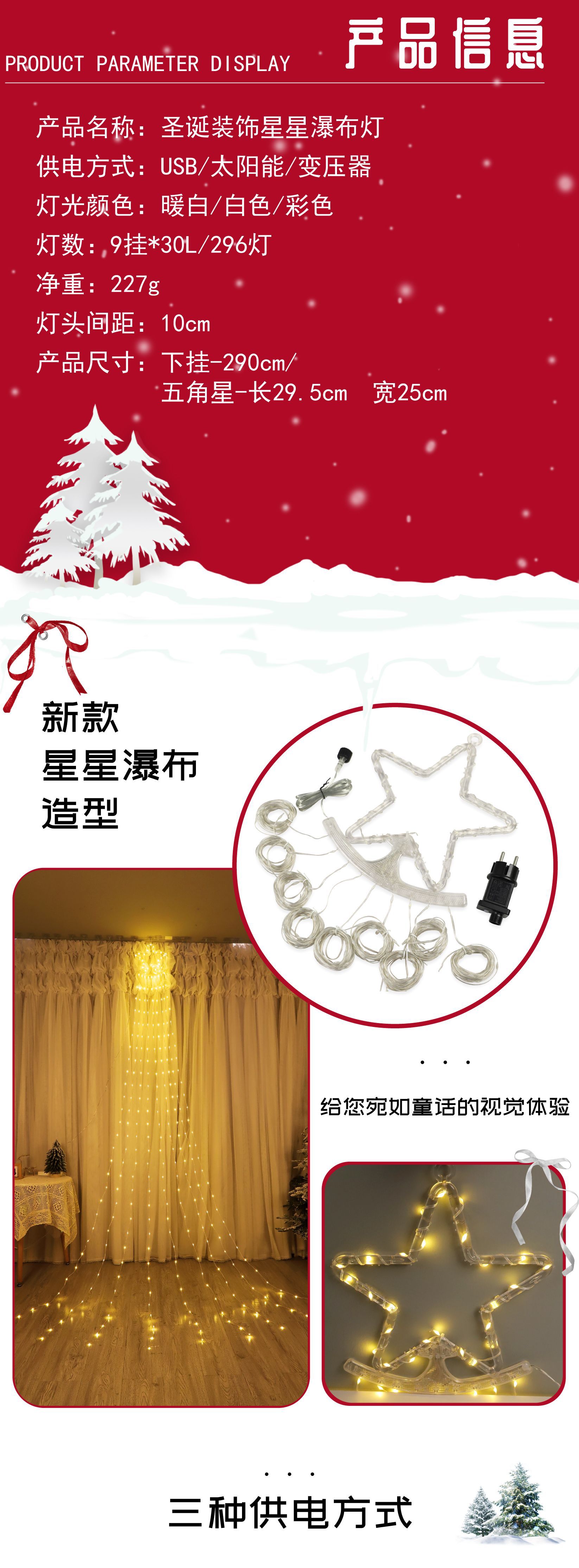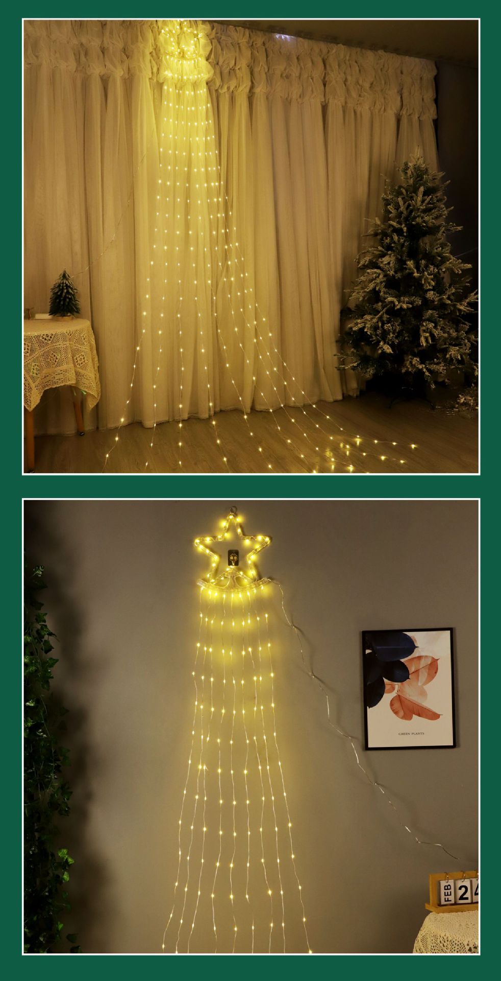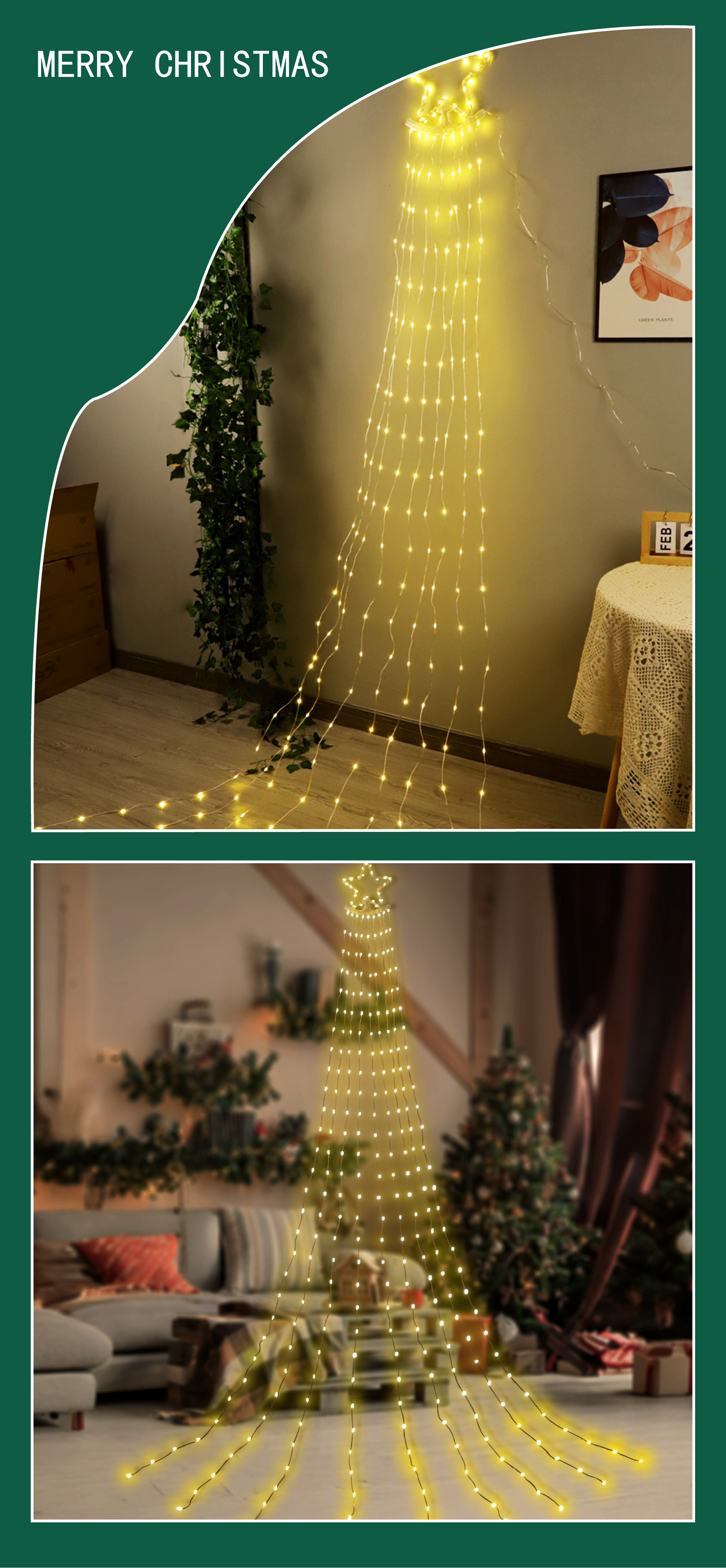 | Color | 2m 200 lámparas - blanco cálido, 2m 200 lámparas - blanco, 2m 200 lámparas - color, 3m 295 lámparas - blanco cálido, 3m 295 lámparas - blanco, 3m 295 lámparas - color |