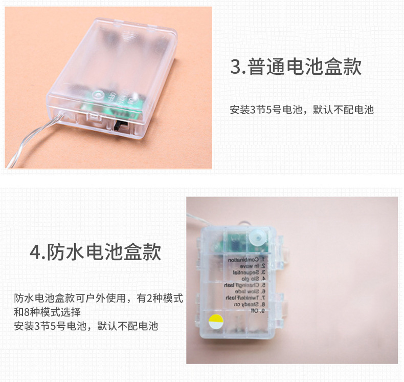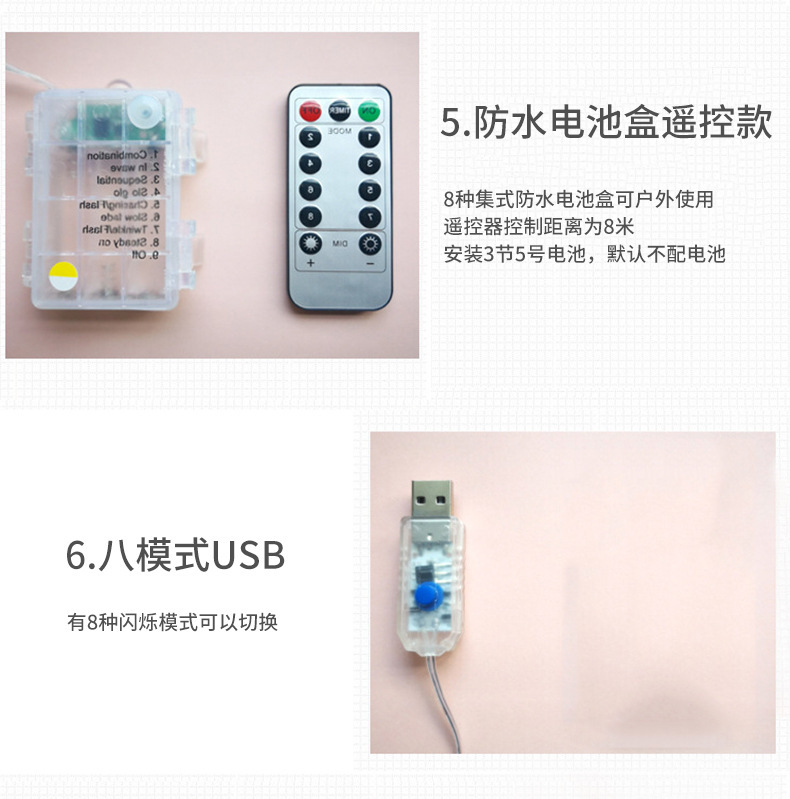 | Potencia | 1.5 M10 lámparas-batería modelo [normalmente iluminado], 3m20 lámparas-batería modelo (normalmente iluminado con parpadeo), 6m40 lámparas-batería modelo (normalmente iluminado con parpadeo), 10m80 lámparas-batería modelo (normalmente iluminado con parpadeo), 3m20 lámparas-enchufe, 6m40 lámparas-USB [normalmente iluminado], 6m40 lámparas-enchufe, 10m100 lámparas-caja de batería impermeable USB dual control remoto, 10m100 lámparas-enchufe con enchufe de cola, 20m200 lámparas-enchufe con enchufe, 30m 300 lámparas - enchufe sin cola, 10m 100 lámparas - control remoto de doble carga USB solar |