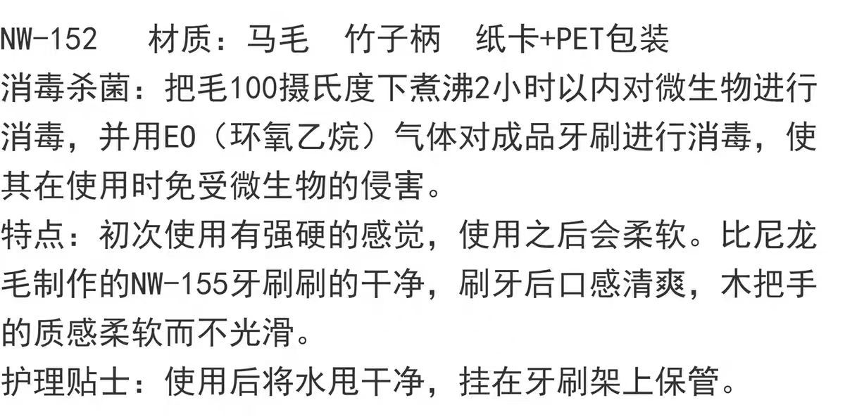 | Color | NW - 152 cepillo de dientes de mango de bambú, NW - 153 cepillo de dientes de mango de bambú, NW - 154 cepillo de dientes de madera de cera blanca, NW - 155 cepillo de dientes de haya, NW - 156 mezcla 4 paquetes, NW - 156 mezcla 2 paquetes |