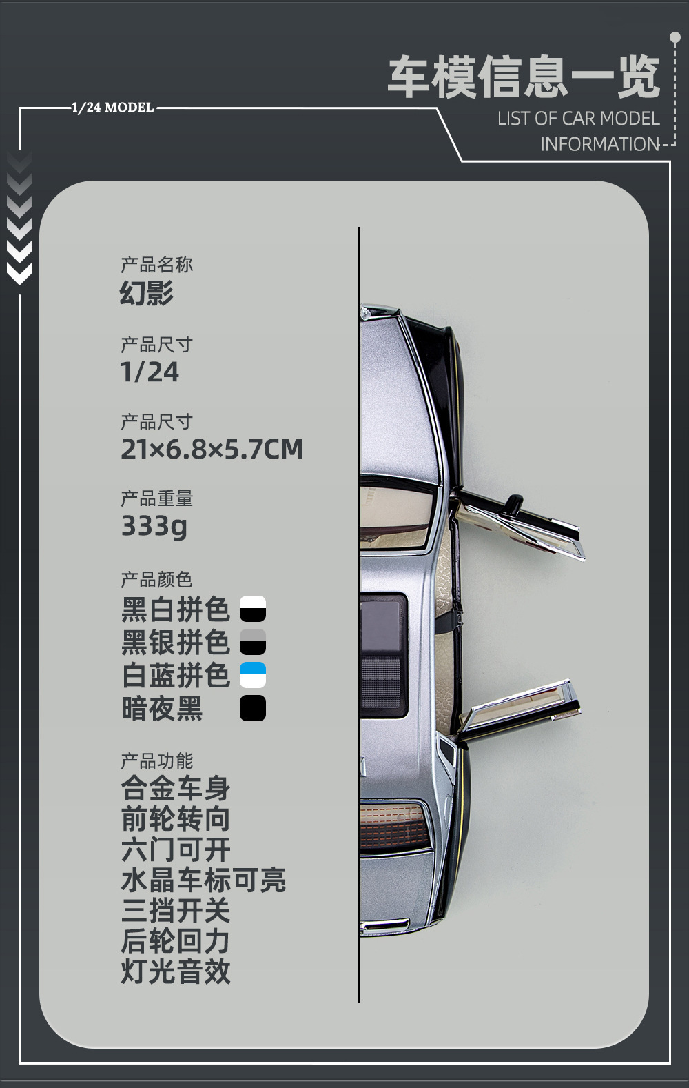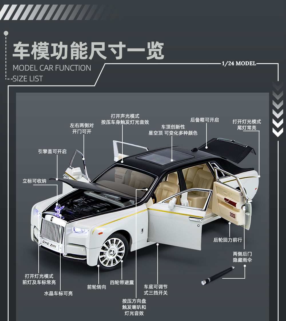 | Color | 1比24车致雅阁-白,1比24车致雅阁-黑,1比24车致雅阁-红,1比24车致宝玛M8-星空紫,1比24车致宝玛M8-黑,1比24车致宝玛M8-蓝,1比24车致幻影-黑白,1比24车致幻影-黑,1比24车致幻影-黑银,1比24车致幻影-蓝白,1比24车致红旗H9-紫,1比24车致AMG GLS600-黑银,1比24车致AMG GLS600-黑白,1比24车致AMG GLS600-棕,1比24金立方雷克萨斯ES300H-白,1比24金立方雷克萨斯ES300H-黑,1比24金立方雷克萨斯ES300H-银,1比24车致马中良驹-白,1比24车致马中良驹-黑,1比24车致马中良驹-黄,1比24车致马中良驹-蓝,1比24金立方300SL-黑,1比24金立方300SL-红,1比24金立方300SL-绿,1比24金立方300SL-蓝,1比24OK凯迪拉克-黑,1比24智冠问界M9-蓝,1比24智冠问界M9-黑,1比24黑曼巴问界M9-蓝,1比24黑曼巴问界M9-红,1比24车致红棋-黑,1比22嘉业幻影-黑白,1比22嘉业幻影-蓝白,1比22嘉业幻影-黑,1比24车致闪灵-黑银,1比24车致闪灵-紫,1比24金立方宝玛m8-白,1:24金立方路虎卫士越野版-灰,1:24车致柯尼塞格--白,1:24车致柯尼塞格--黑,1:24车致柯尼塞格--红,1:24新豪迪特斯拉ROBOTAXI-黑,1:24新豪迪特斯拉ROBOTAXI-紫,1:24新豪迪特斯拉ROBOTAXI-金,1:24金立方凯迪拉克-红,1:24金立方凯迪拉克-粉,1:24金立方凯迪拉克-黑,1:24金立方凯迪拉克-黄,1:24新奥SLR拉花版-黑,1:24新奥SLR拉花版-红,1:24新奥SLR拉花版-银,1:24车致奔驰SLS-黑,1:24车致奔驰SLS-黄,1:24车致奔驰SLS-白,1:24浩驰奥迪A6L(爆闪版)-黑,1:24浩驰奥迪A6L(爆闪版)-白,1:24黑曼巴黑暗骑士蝙蝠车-黑,1:24智冠问界M9语音版-盒-蓝,1:24智冠问界M9语音版-黑,1:24车致塞纳赛道版-白,1:24车致塞纳赛道版-黑,1:24车致地狱猫跑车电镀版-红,1:24车致地狱猫跑车电镀版-渐变紫,1:24车致地狱猫跑车电镀版-金,1:24车致玛莎MC20-蓝,1:24车致玛莎MC20-红,1:24车致玛莎MC20-黑,1:24车致玛莎MC20-白,1:24车致300SL可乐版-盒-红,1:24车致300SL可乐版-盒-蓝,1:24新豪迪塞纳喷雾版-盒-白,1:24新豪迪塞纳喷雾版-盒-橙,1:24新豪迪塞纳喷雾版-盒-紫,1:24新奥大G探险版-盒-白,1:24新奥大G探险版-盒-黑,1:24新奥大G探险版-盒-蓝,1:24车致凯迪拉克大火箭-盒-白,1:24车致凯迪拉克大火箭-盒-粉,1:24车致凯迪拉克大火箭-盒-黑,1:24车致凯迪拉克大火箭-盒-红,1:24金车将凯迪拉克大火箭-盒-粉,1:24金车将凯迪拉克大火箭-盒-黑,1:24金车将凯迪拉克大火箭-盒-红,1:24金车将凯迪拉克大火箭-盒-蓝,1:24浩驰奥迪RS7-盒-黑,1:24浩驰奥迪RS7-盒-灰 |