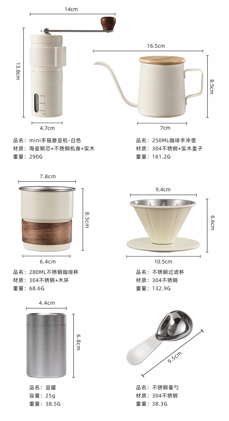 | Componentes | Molinadora de frijoles, taza de café, cuchara de medición, taza de filtro, olla de lavado manual |