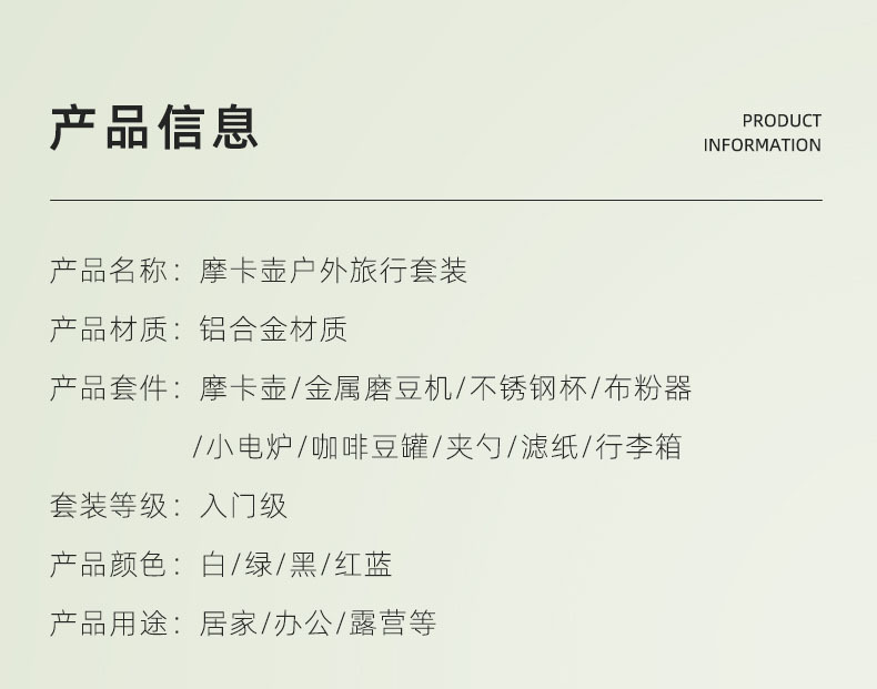 | Colores | Juego de 9 piezas para maleta exterior [blanco],Juego de 9 piezas para maleta exterior [negro],Juego de 9 piezas para maleta exterior [verde],Juego de 9 piezas para maleta exterior [color de contraste rojo y azul],Juego de 9 piezas de doble válvula verde [versión de maleta exterior],Juego de 9 piezas blanco de doble válvula [versión de maleta exterior],Juego de 9 piezas negro de doble válvula [versión de maleta exterior] |