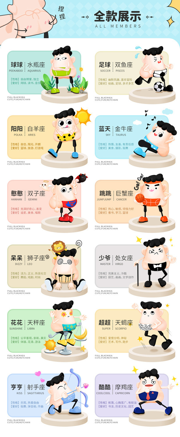 | Color | Joven maestro (Virgo) envía pinzas, bola (Acuario) envía pinzas, Heng Heng (Sagito) envía pinzas, Yang Yan (Génios) envía pinzas, Ultra (Escorpio) envía pinzas, Cool (Capricornio) envía pinzas, Stupid (Leo) envía pinzas, Jumping (Cáncer) envía pinzas, Flower (Libra) envía pinzas, Blue Sky (Tauro) envía pinzas, Fútbol (Peces) envía pinzas, Yang Yang (Aries) envía pinzas |