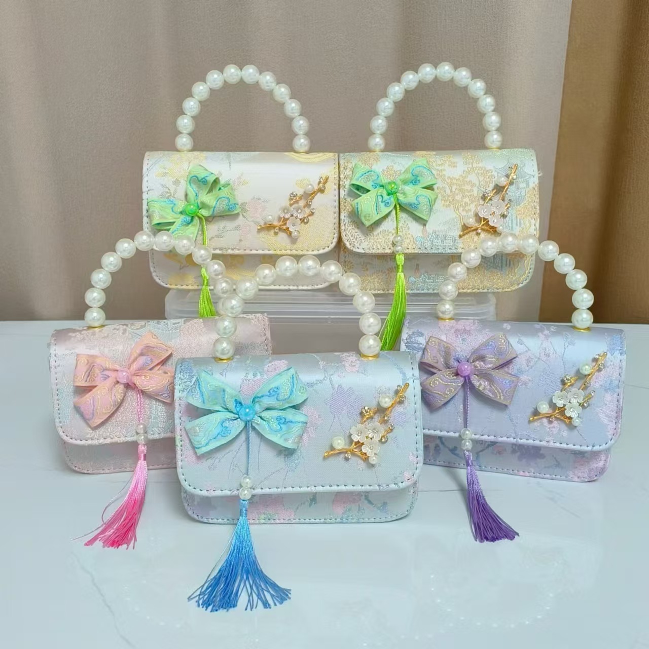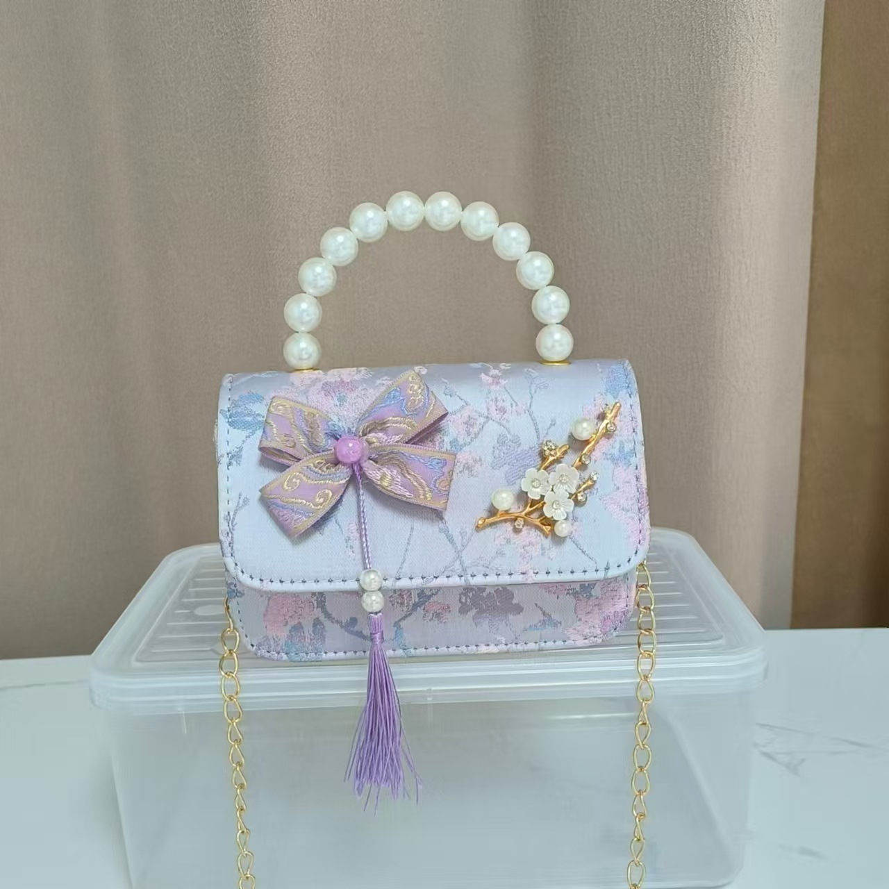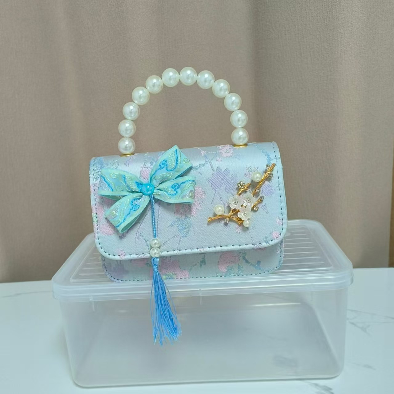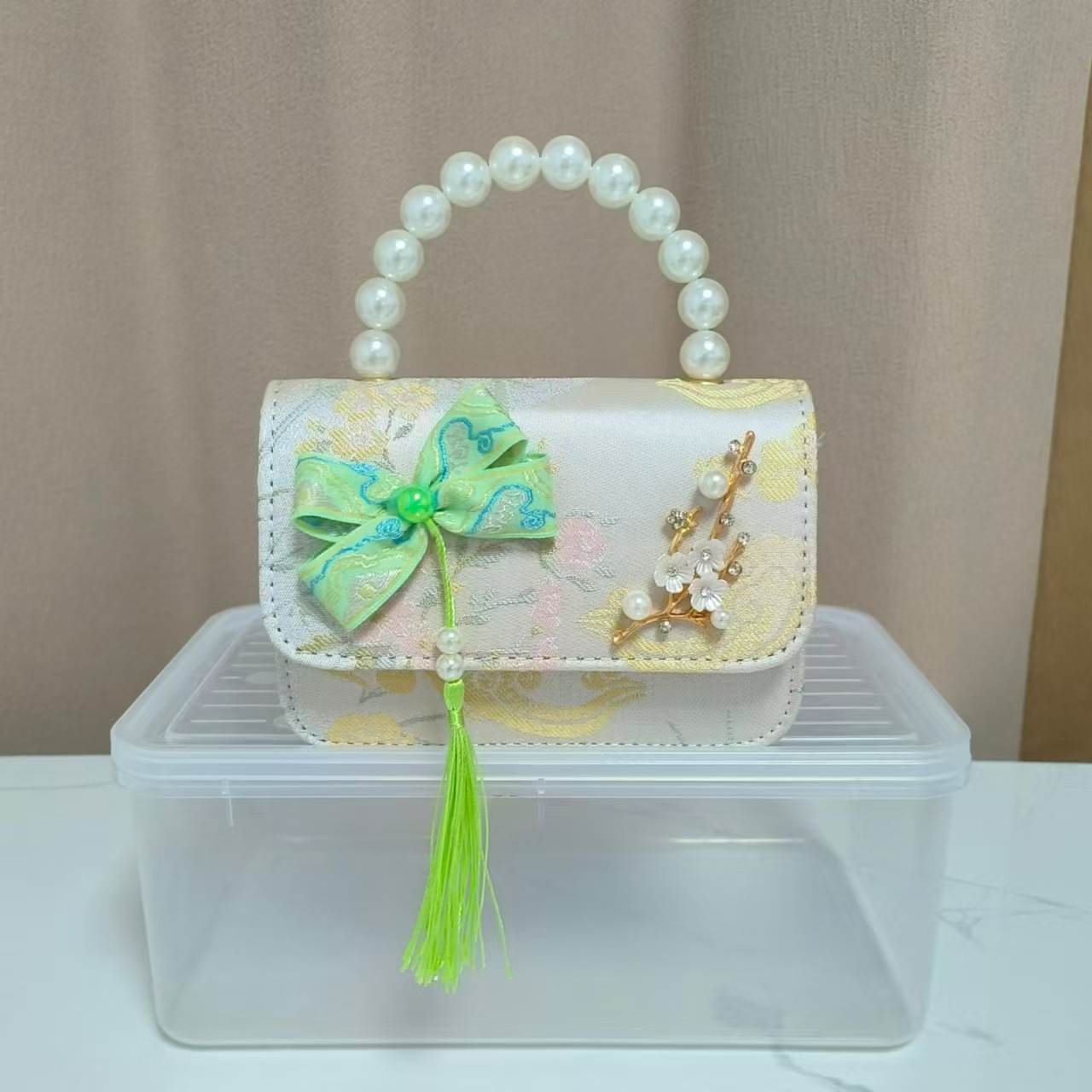 蝴蝶结国风公主包唐装配饰包链条珍珠手提包六一儿童节斜挎包方包