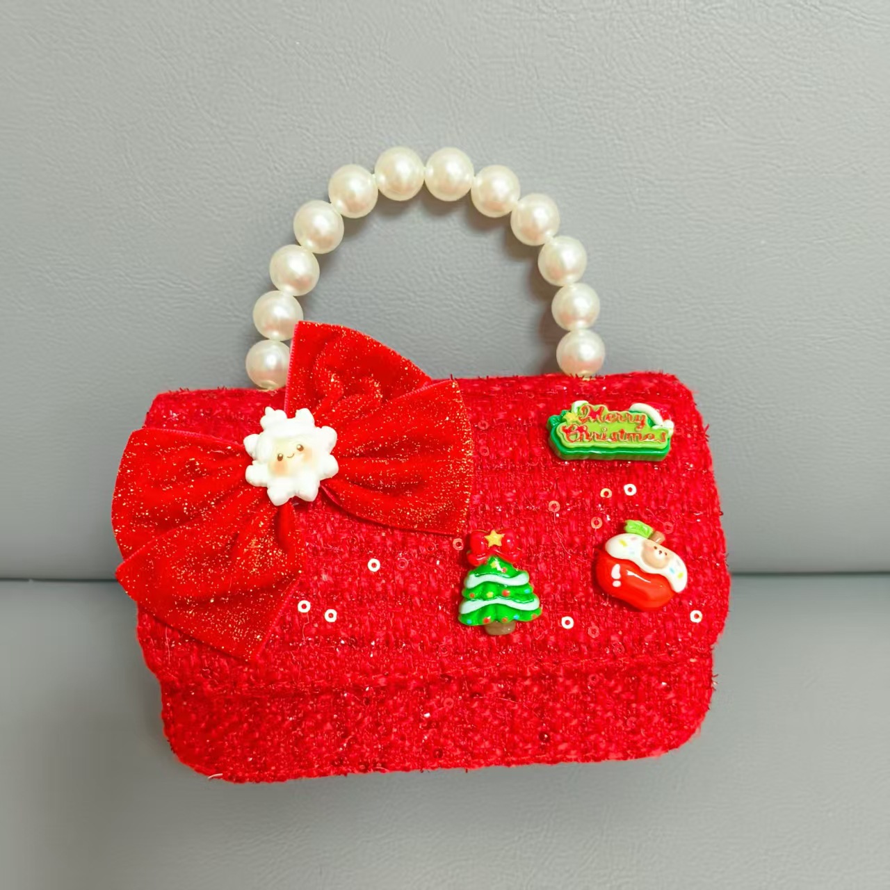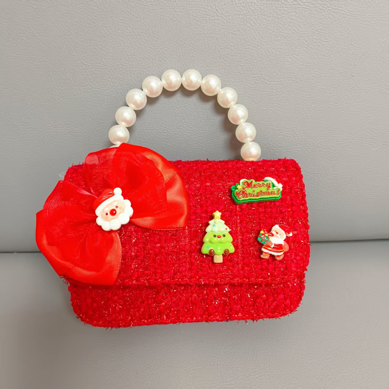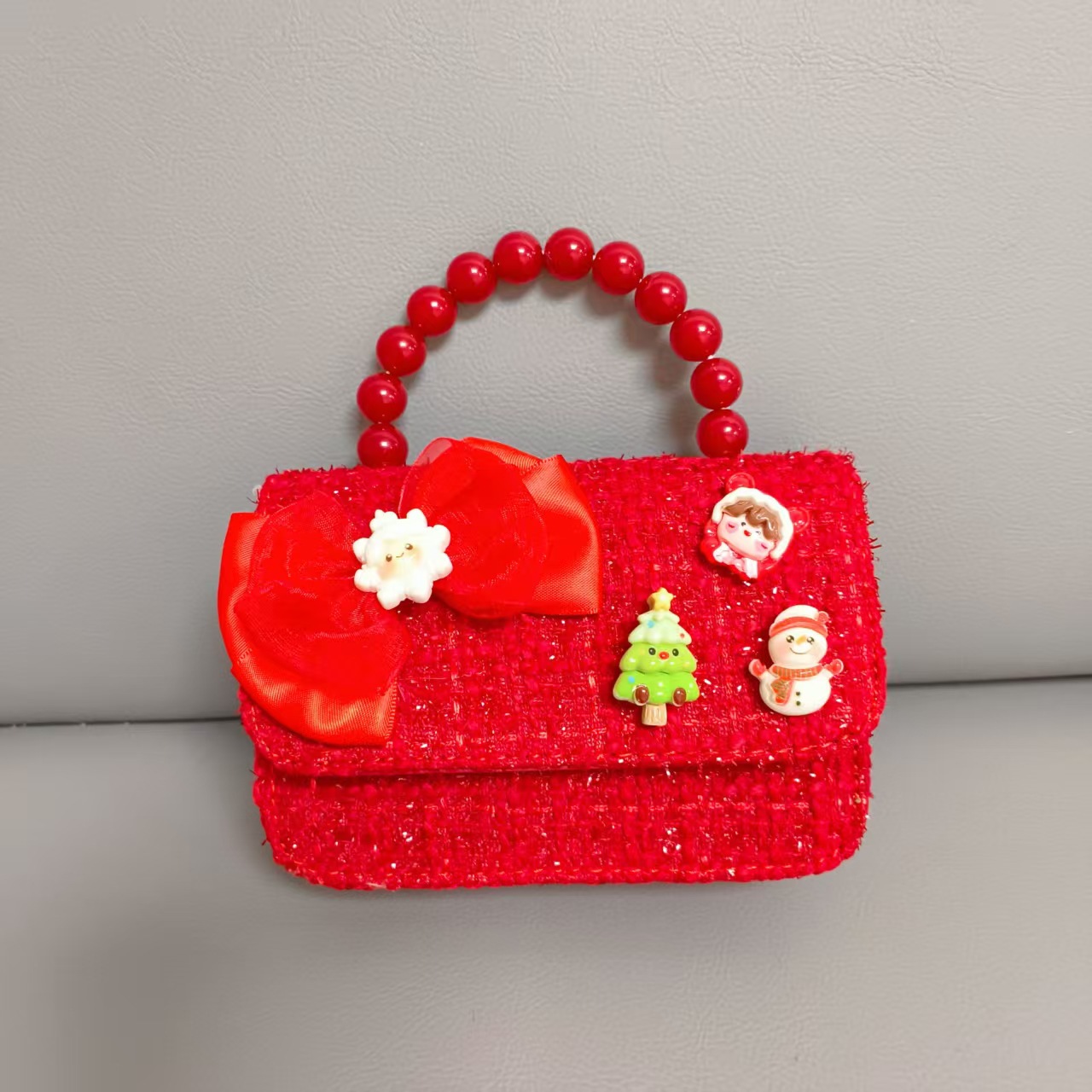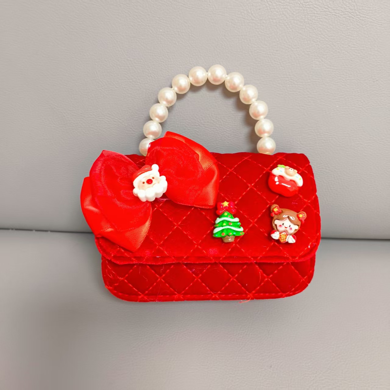 红色新年压岁钱包蝴蝶结圣诞老人珍珠手提包小香风链条单肩斜挎包