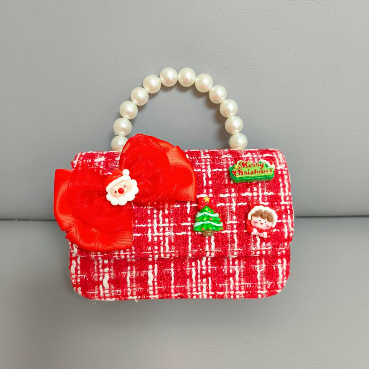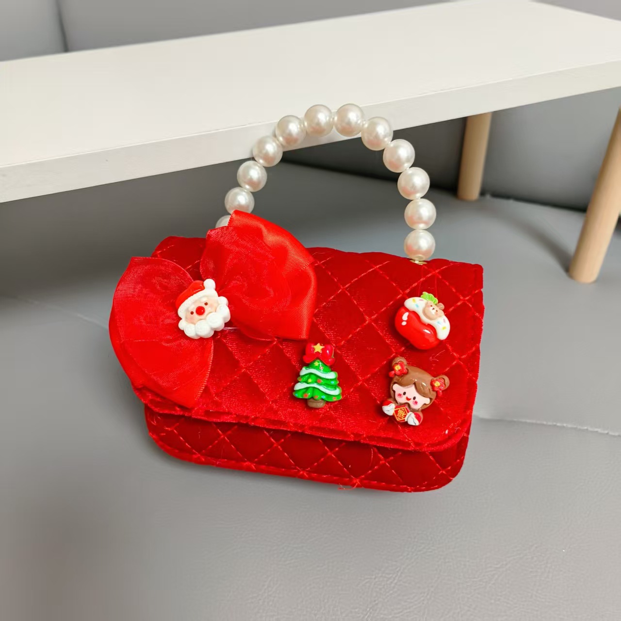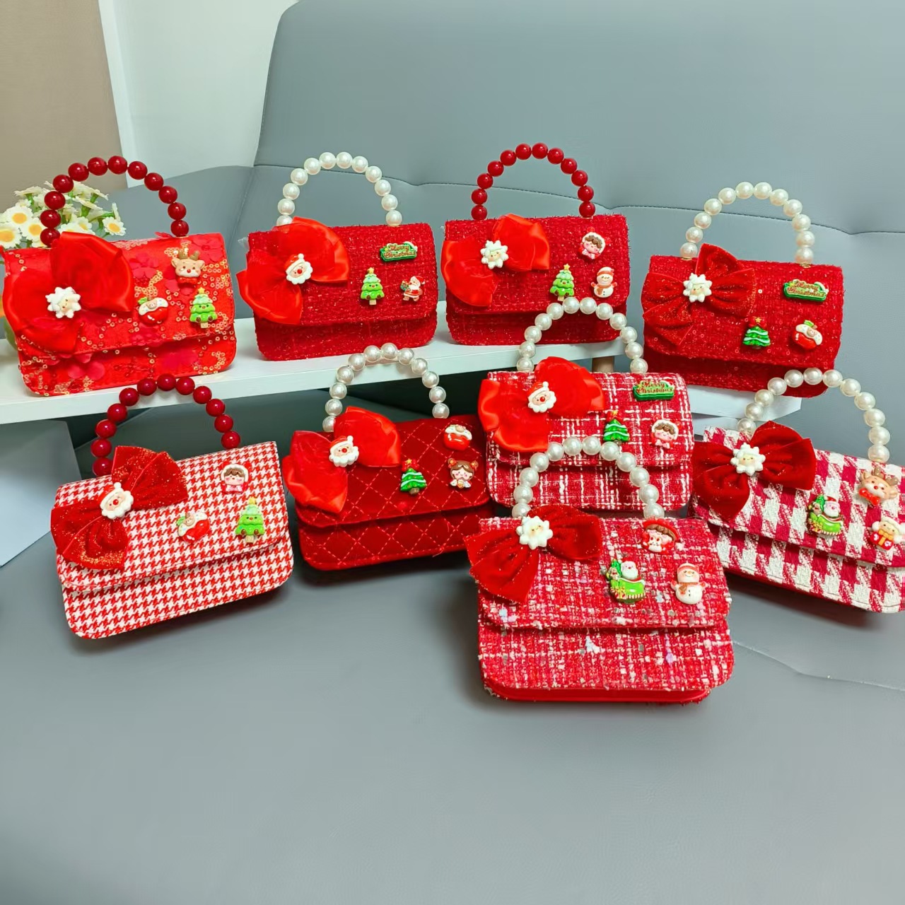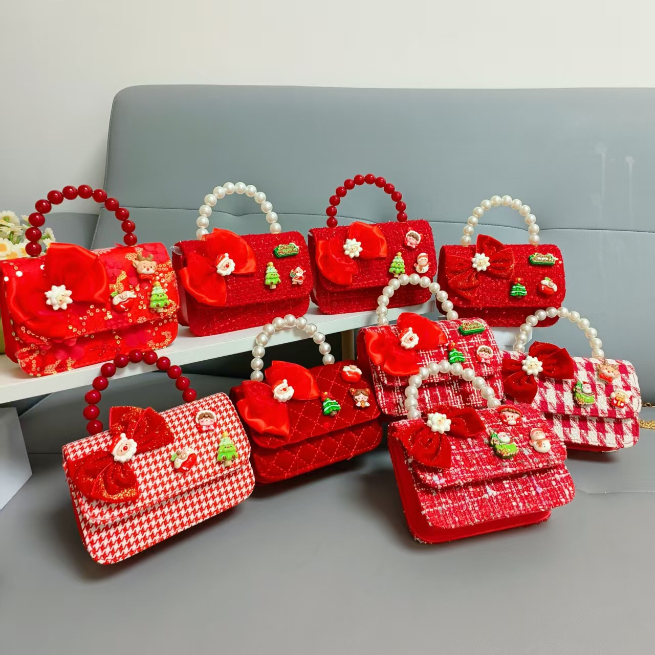 红色新年压岁钱包蝴蝶结圣诞老人珍珠手提包小香风链条单肩斜挎包