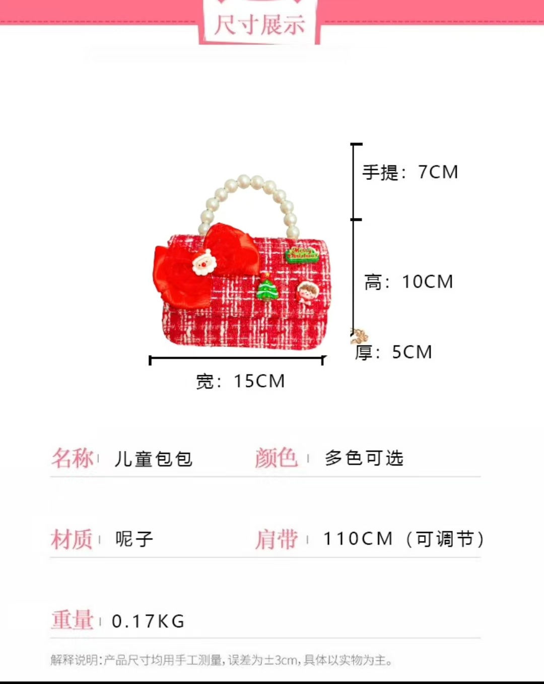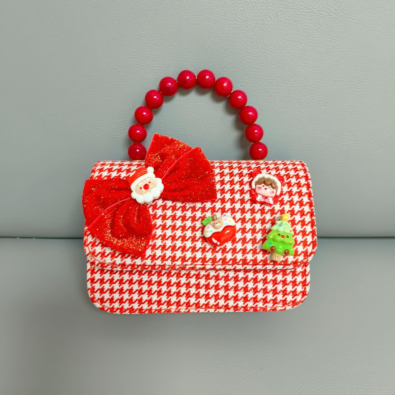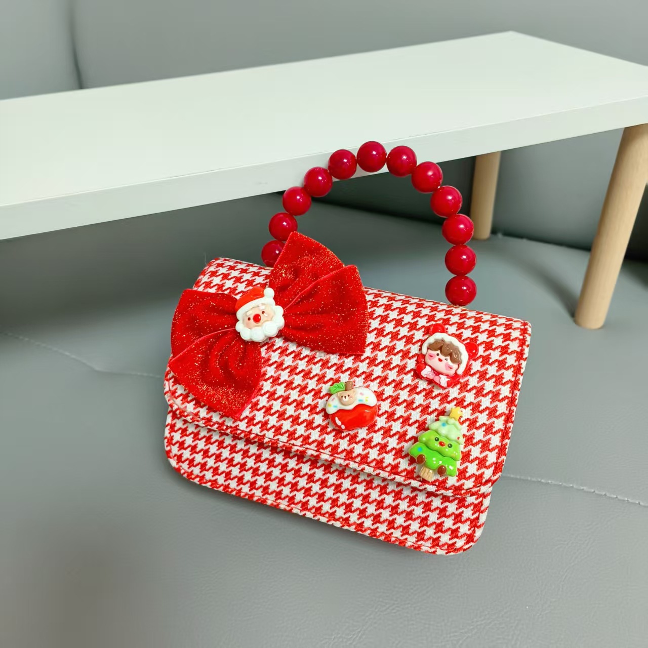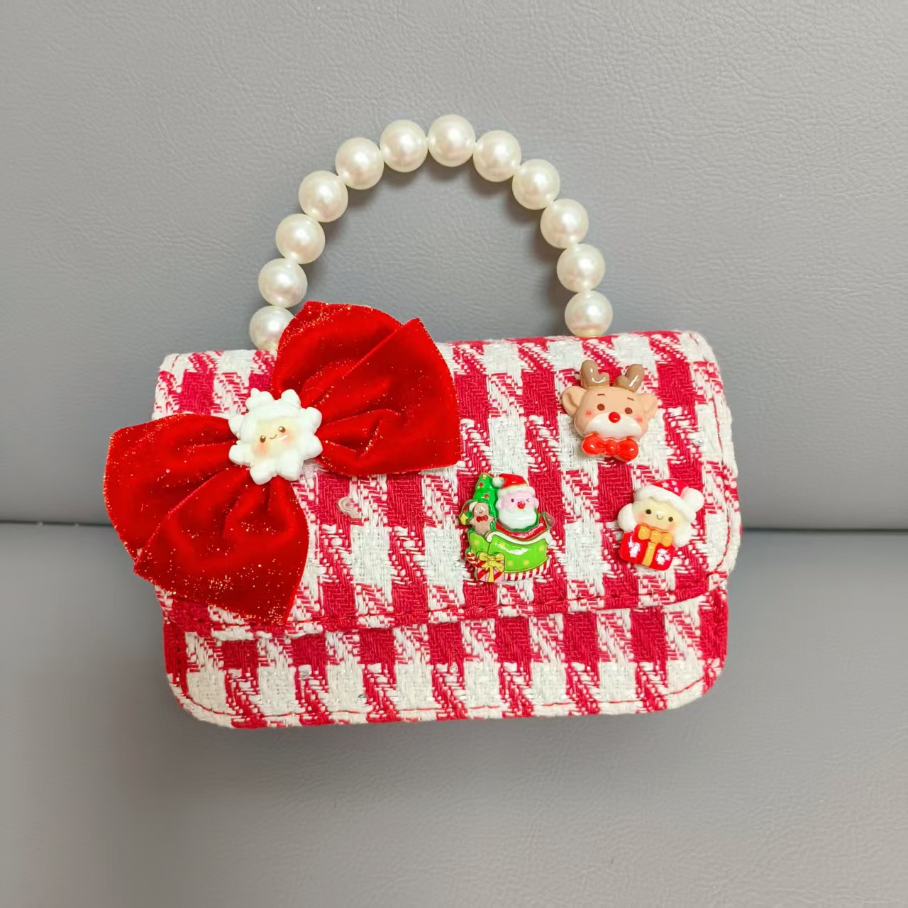 红色新年压岁钱包蝴蝶结圣诞老人珍珠手提包小香风链条单肩斜挎包