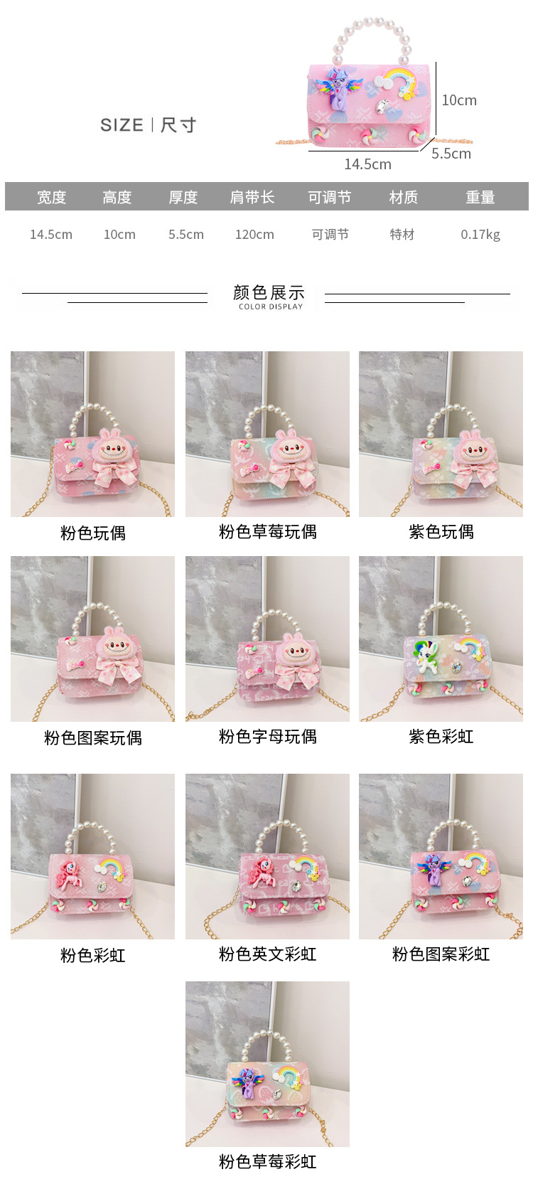 | Color | Muñeca rosa, muñeca de fresa rosa, muñeca púrpura, muñeca de patrón rosa, muñeca de letras rosa, arco iris rosa, arco iris de fresa rosa, arco iris púrpura, arco iris de patrón rosa, arco iris de letras rosa |