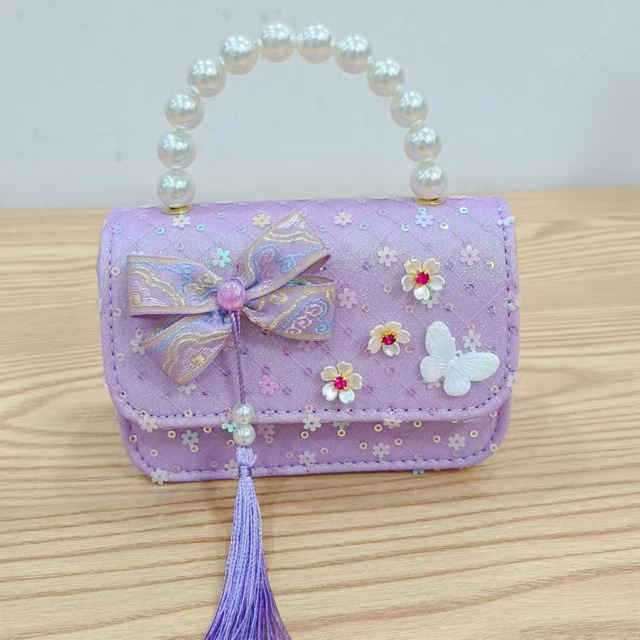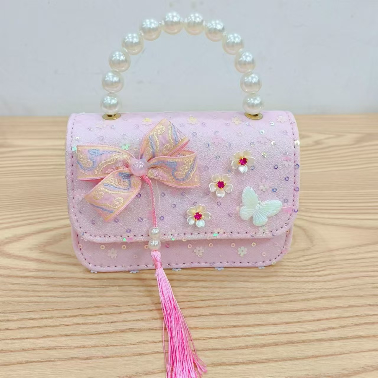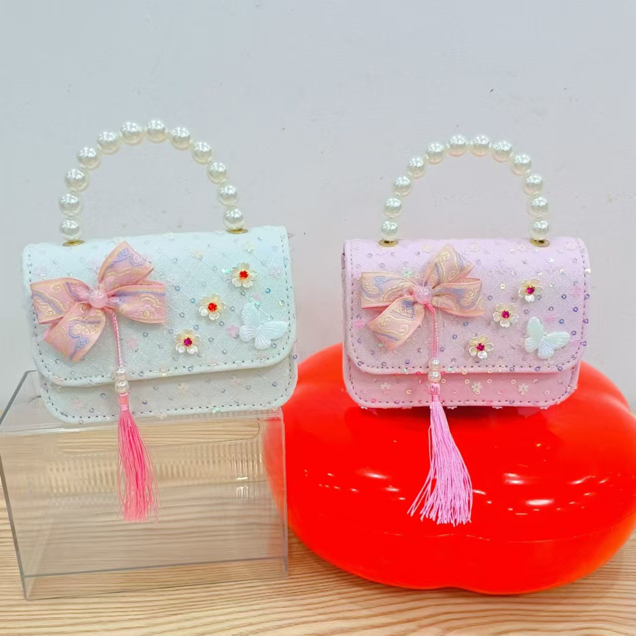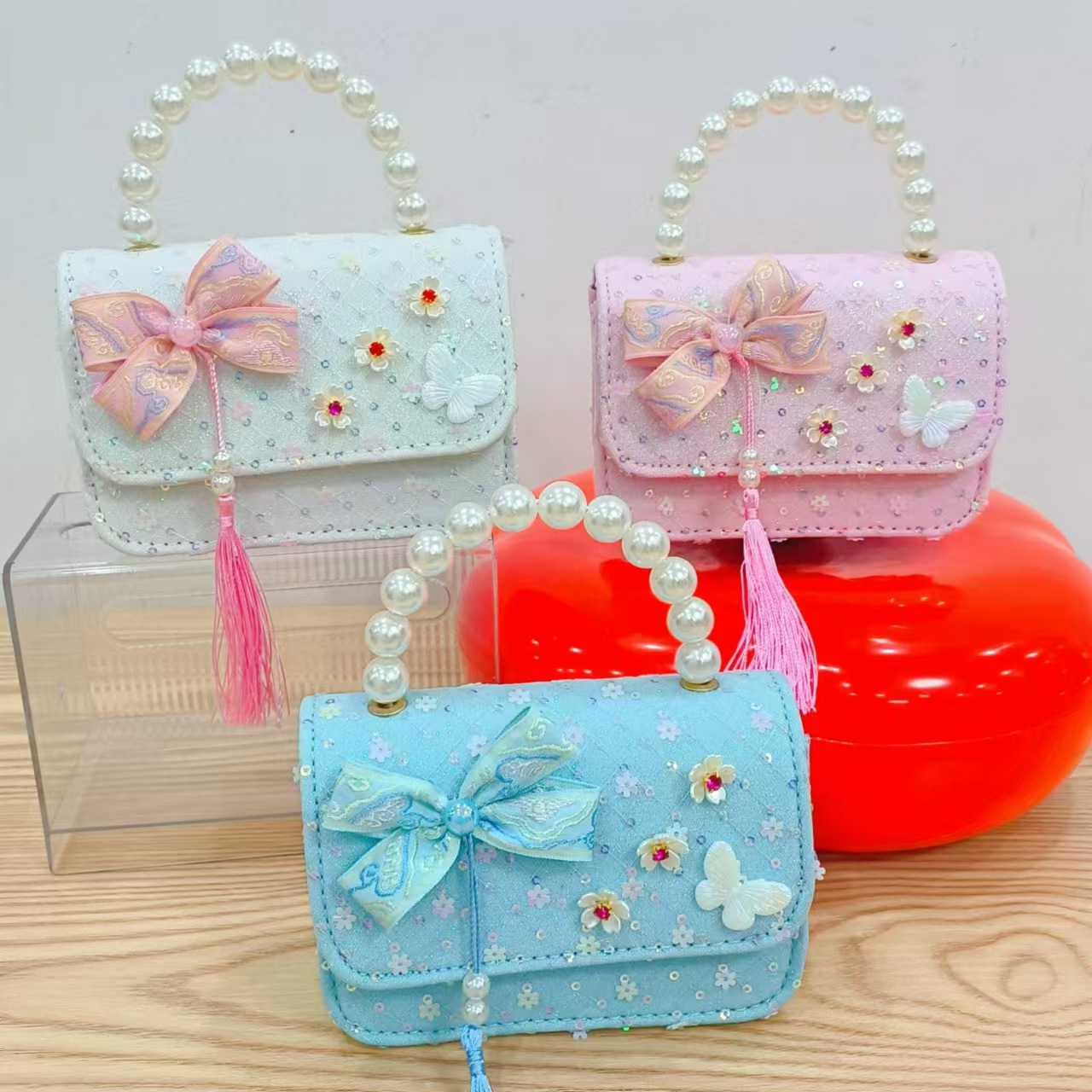 珍珠手提包国风蝴蝶结公主包女孩压岁钱包六一儿童节礼物链条方包