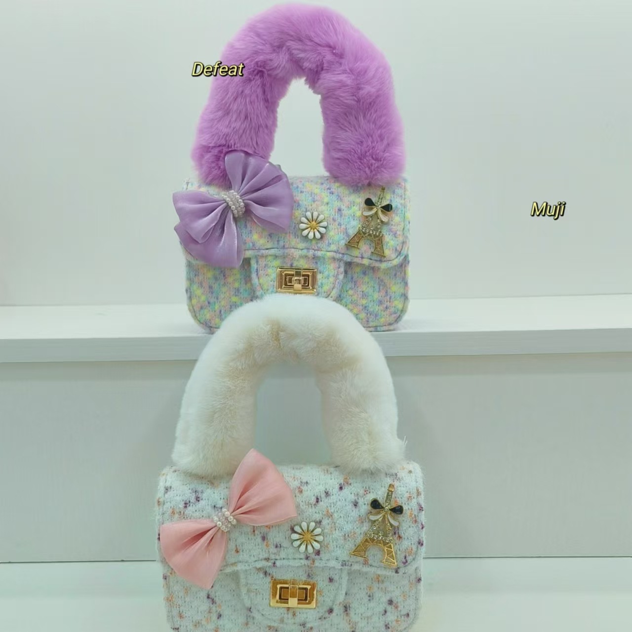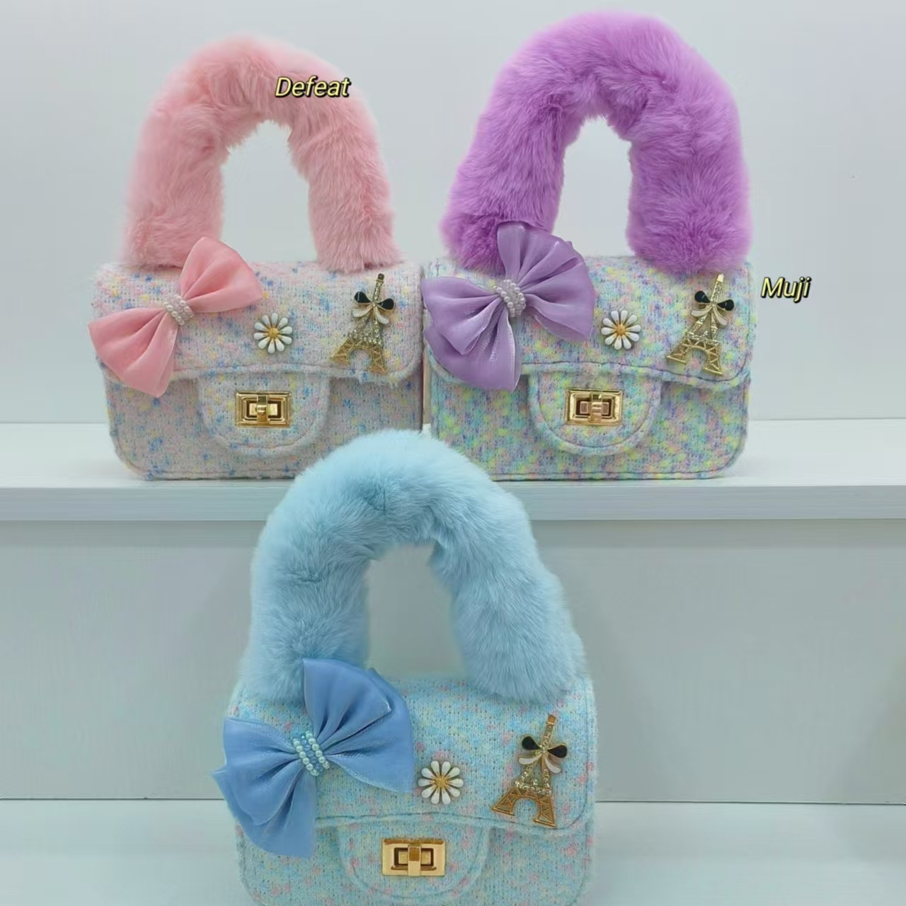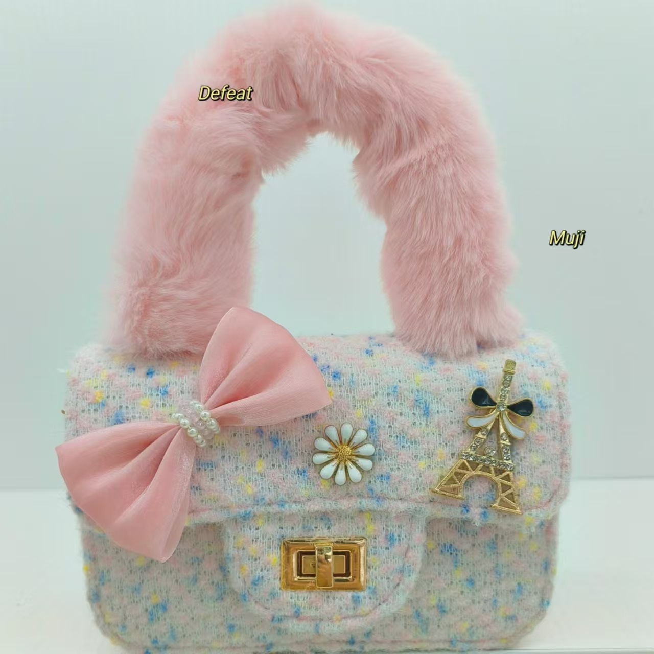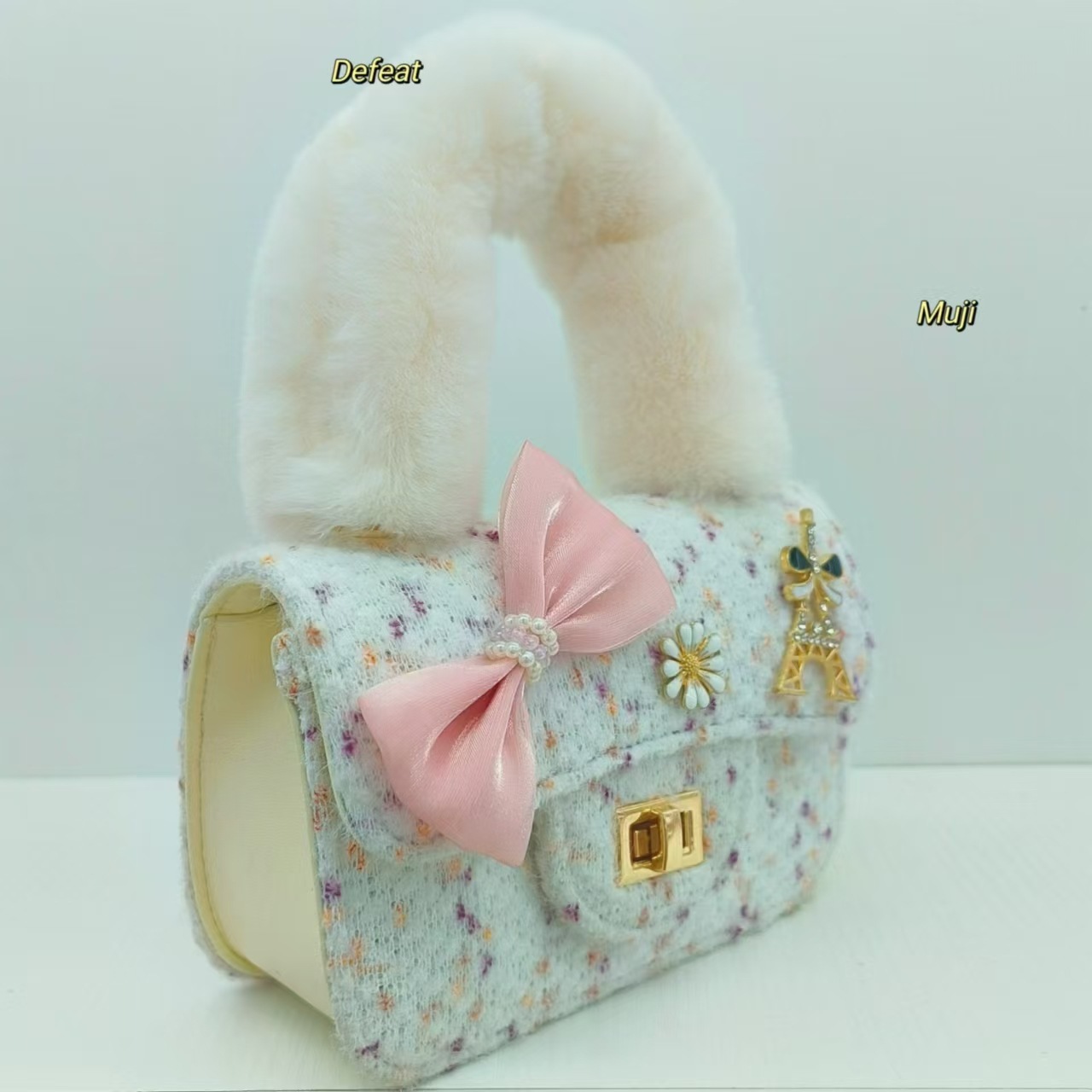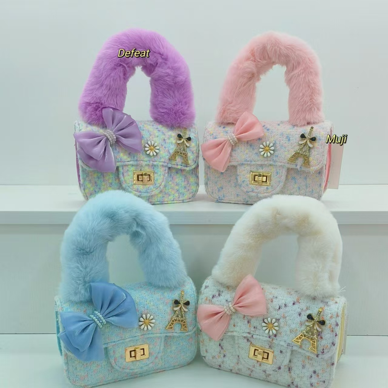 毛绒手提包蝴蝶结时尚单肩包小女孩洋气斜挎包小方包零钱包配饰包