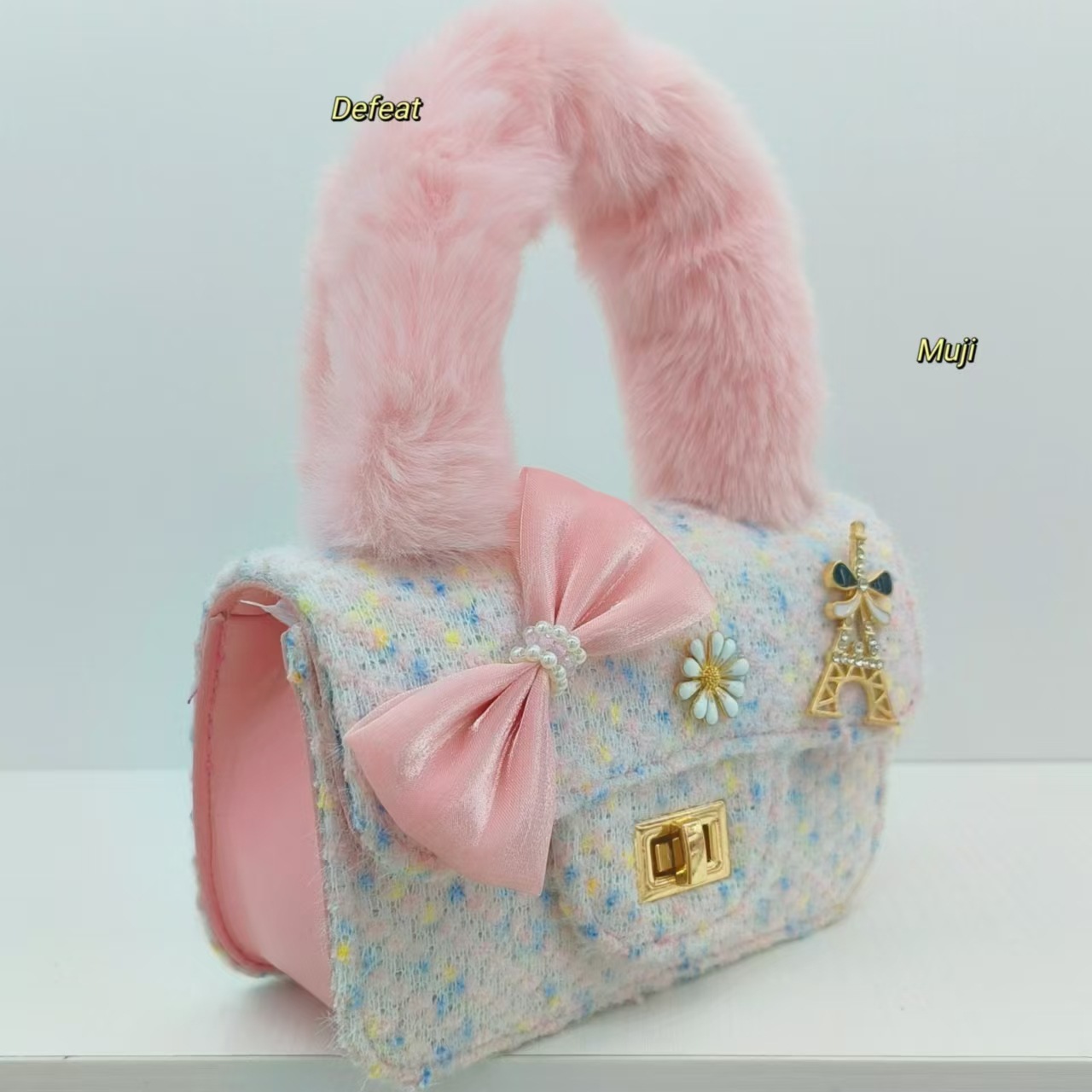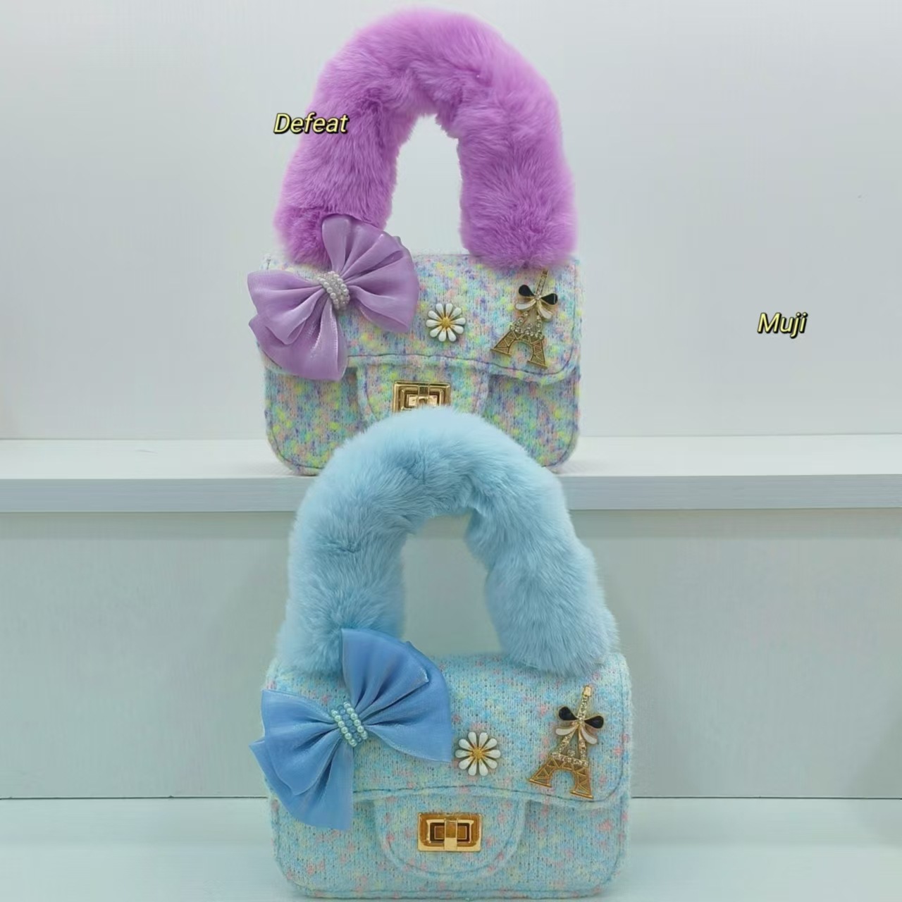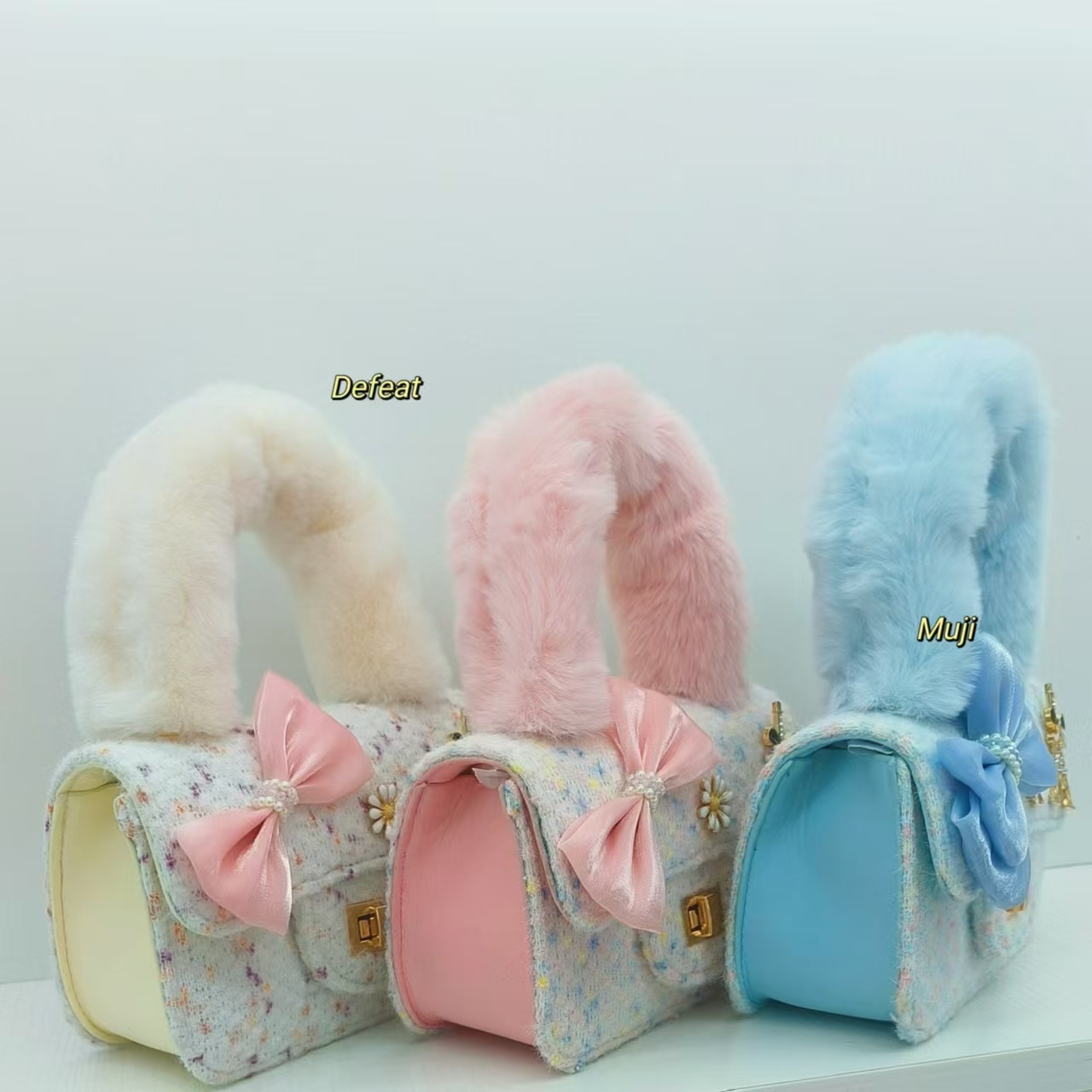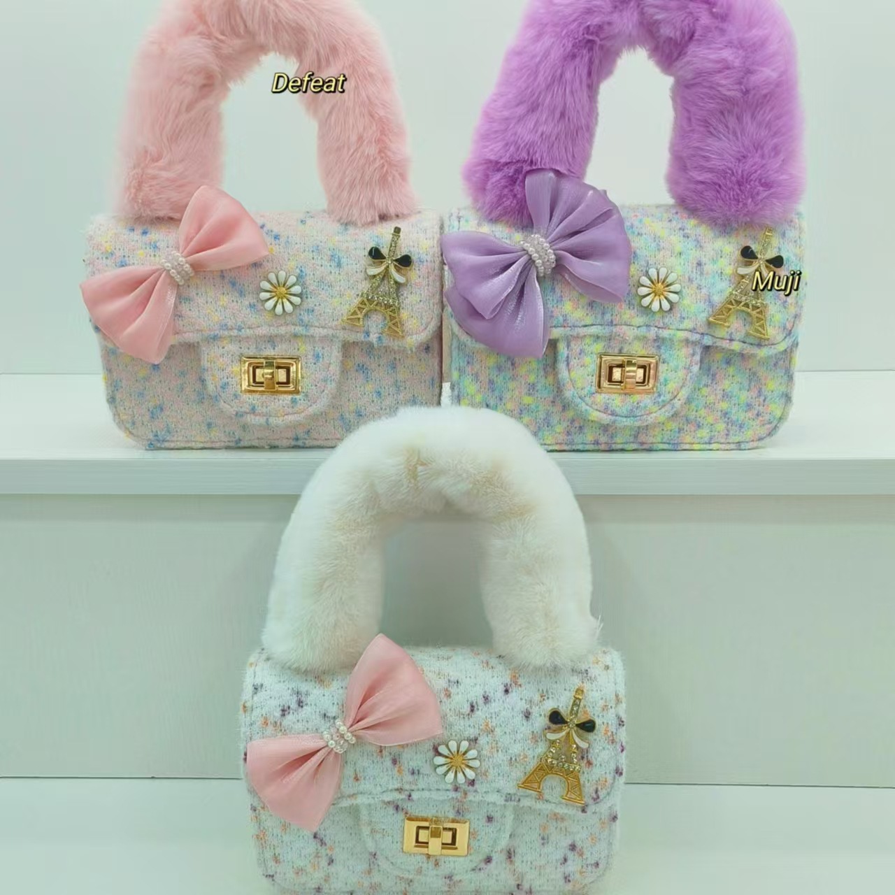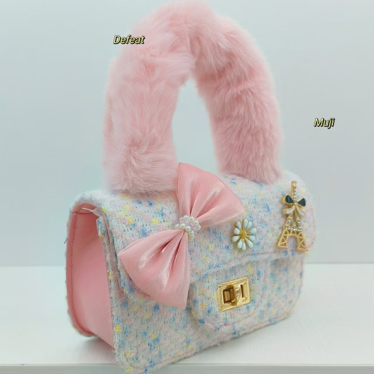 毛绒手提包蝴蝶结时尚单肩包小女孩洋气斜挎包小方包零钱包配饰包